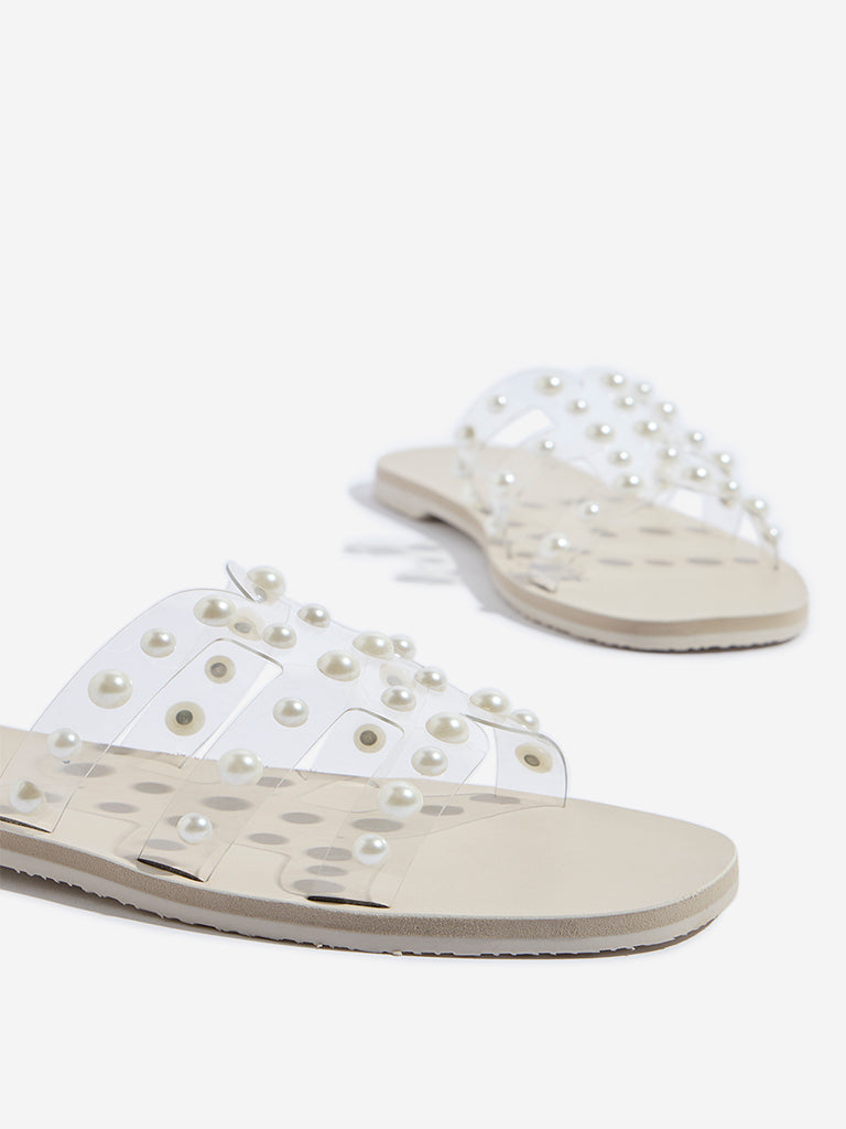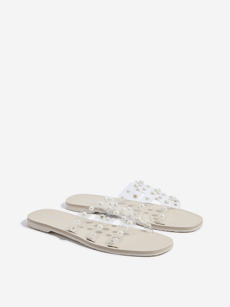 These ivory slides from Luna Blu strike the perfect balance between minimalism and elegance. The vinyl straps showcase intricate cut-out detailing. embellished with faux pearls for a hint of glamour. Designed for all-day ease. they rest on a cushioned flat sole. while the textured outsole ensures a secure grip with every step.