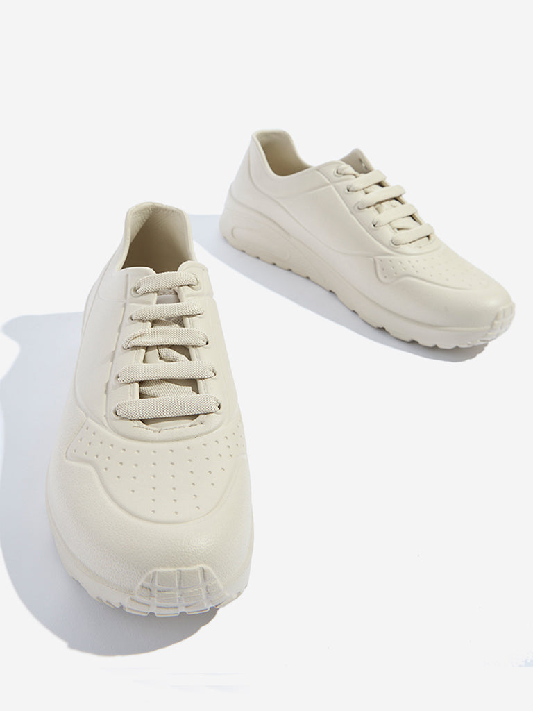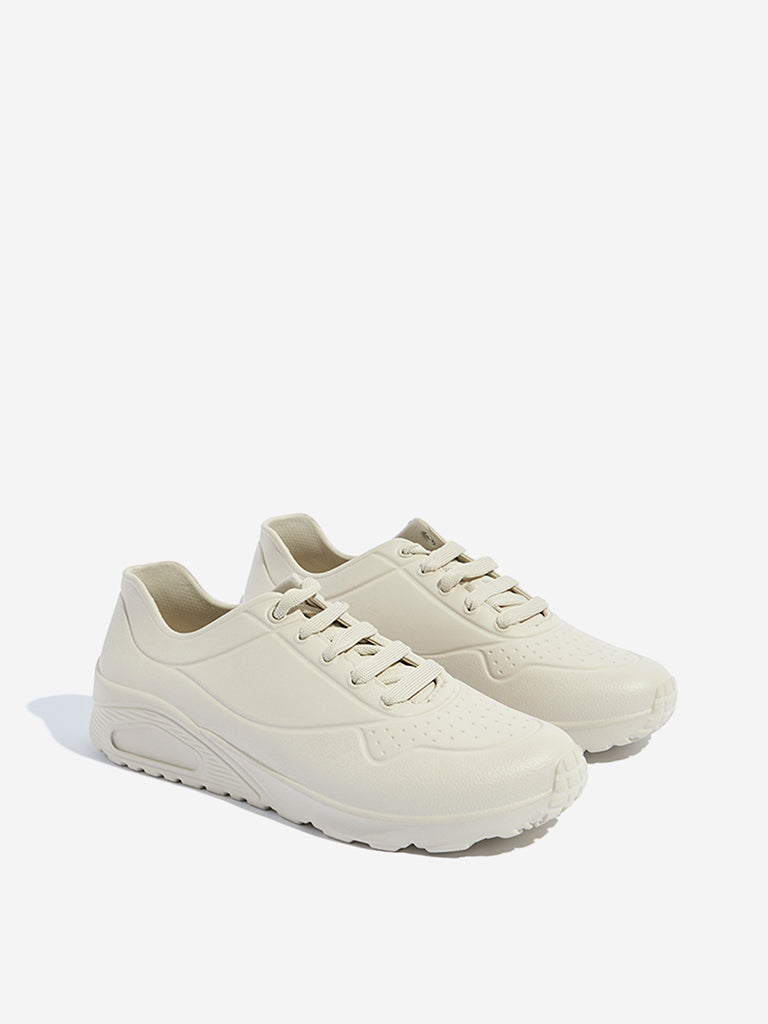 These ivory sneakers from Luna Blu feature a classic lace-up design with perforated detailing on the vamp for added breathability. Crafted with a cushioned insole for all-day comfort and a durable ridged outsole for enhanced grip. this pair offers the perfect blend of style and function.