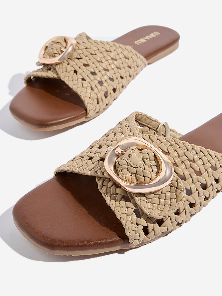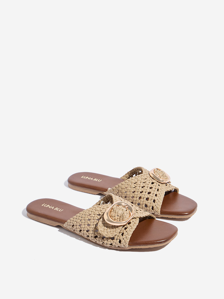LUNA BLU Ivory Rattan Weave Buckled Slides