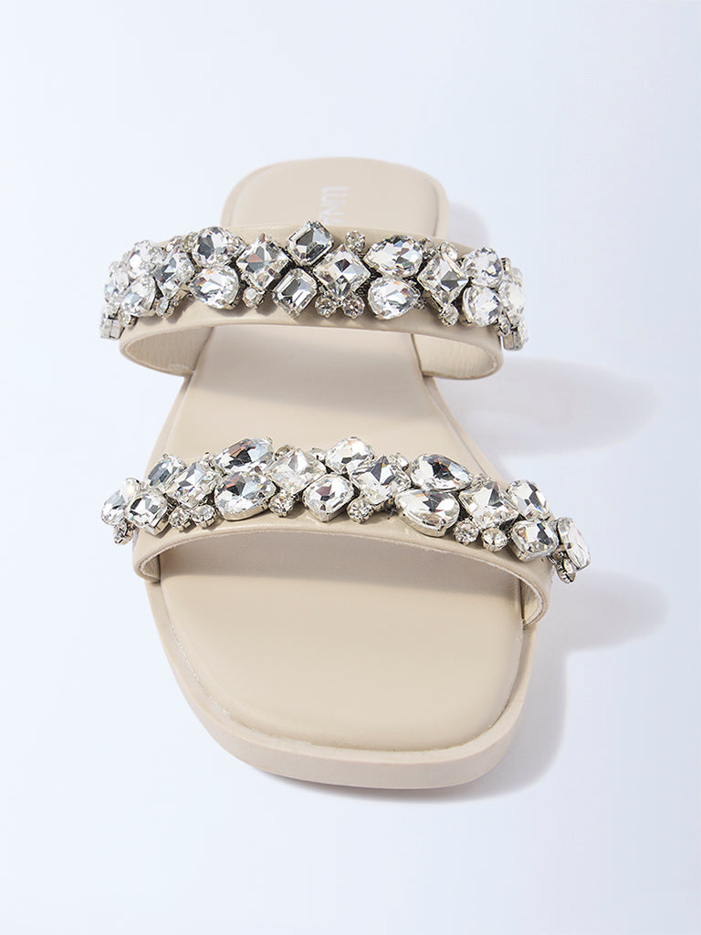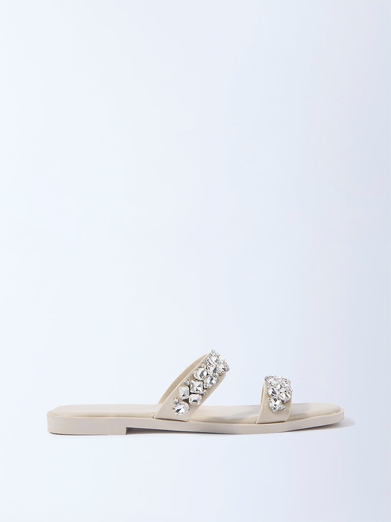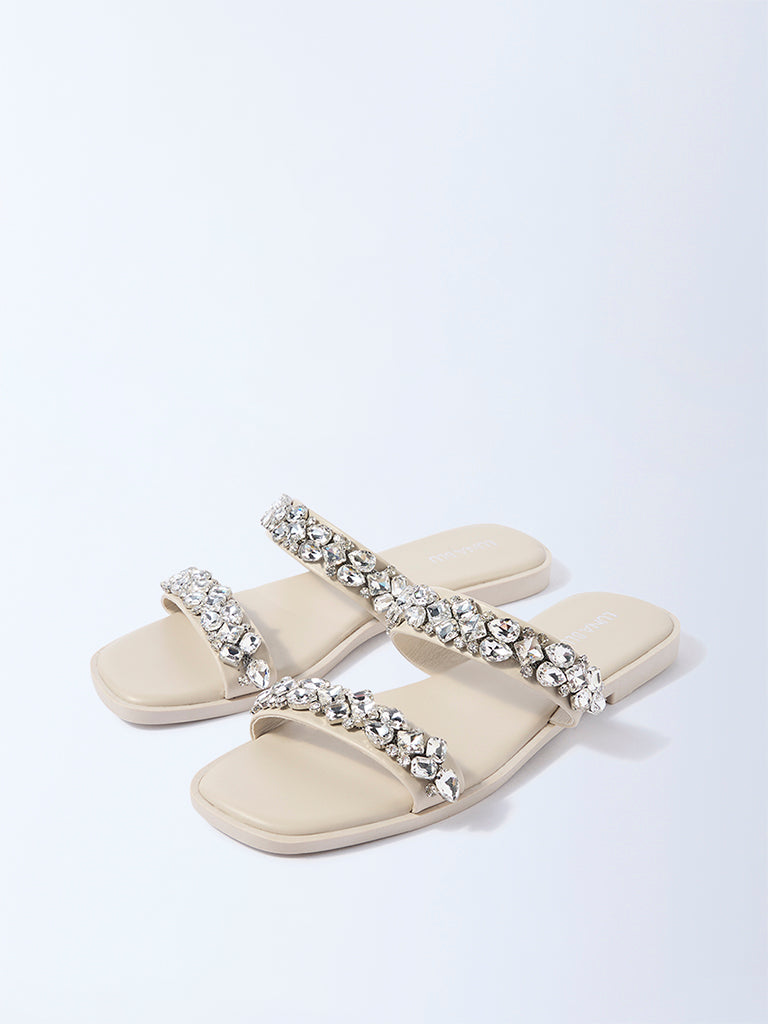 Dazzle at every festive occasion in these ivory sandals from Luna Blu. where twin straps are encrusted with oversized rhinestones for maximum sparkle. The open-toe silhouette rests on a flat sole. with a cushioned footbed for all-day comfort and a textured outsole for confident steps.