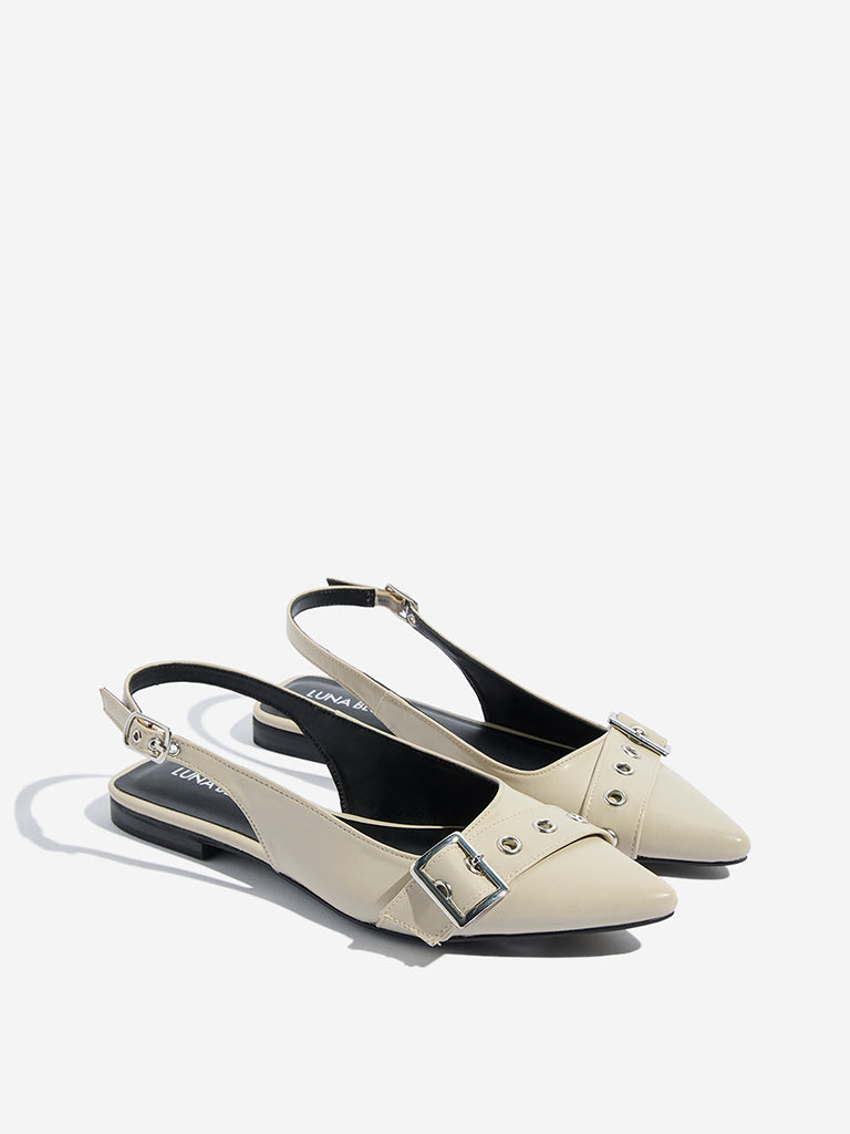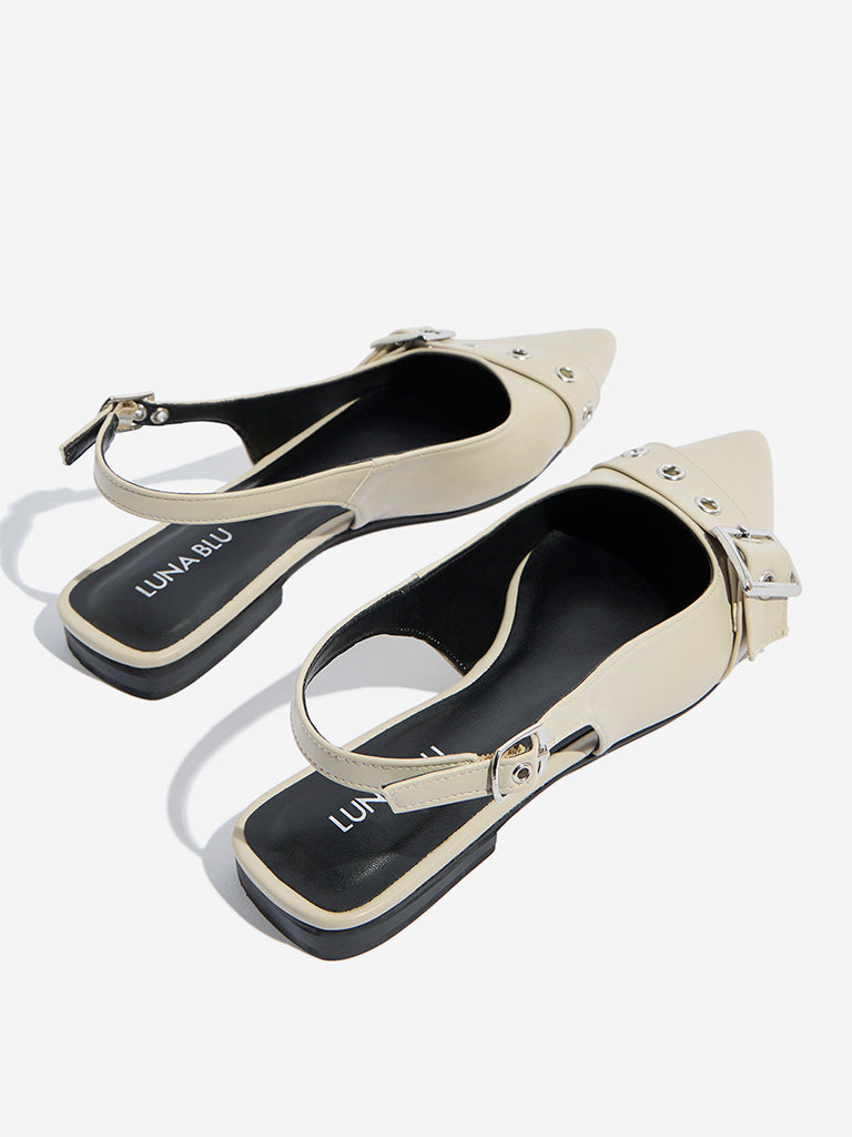 Luna Blu introduces these ivory mules. crafted with a pointed toe and a wide strap detailed with a silver-toned buckle and eyelets for subtle sophistication. The adjustable slingback strap ensures a secure fit. making them an elegant addition to your wardrobe.