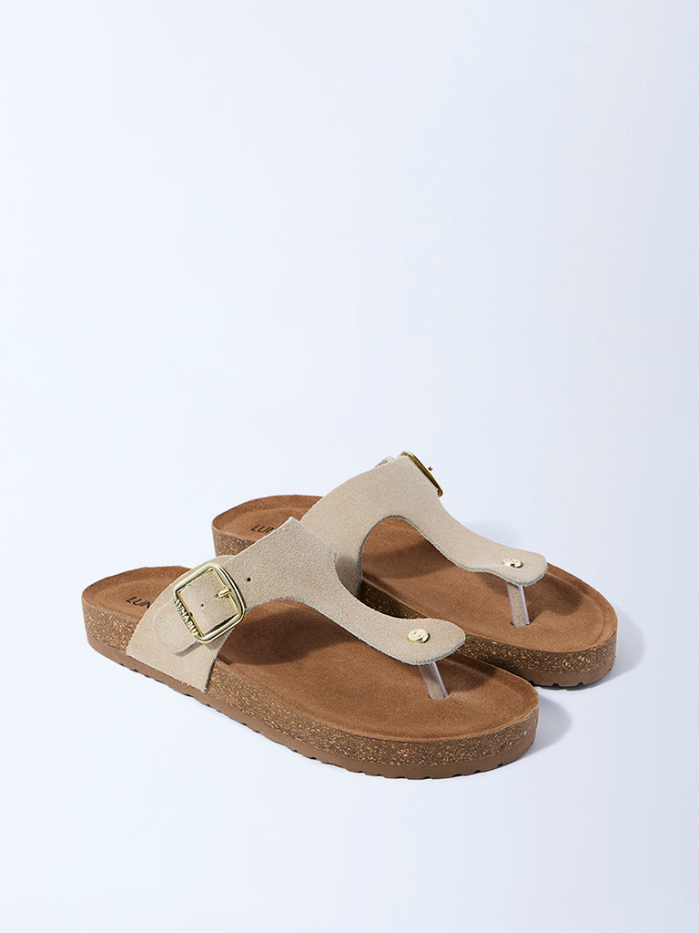 These ivory sandals from Luna Blu combine laid-back charm with thoughtful detailing. Crafted from faux suede. the T-strap design is elevated by a sleek buckle accent that adds a hint of shine. A cushioned insole ensures comfort with every step. while the cork-textured midsole lends a natural finish.