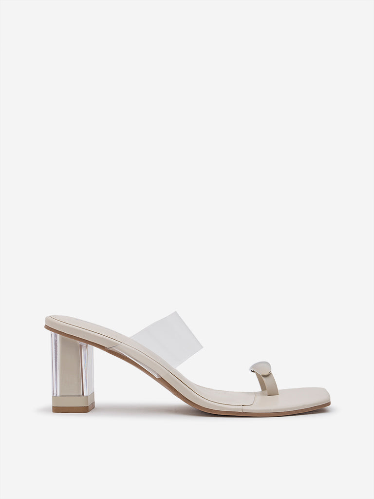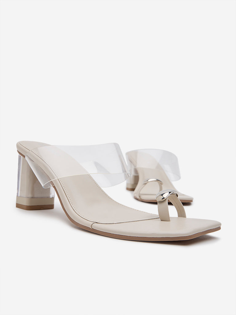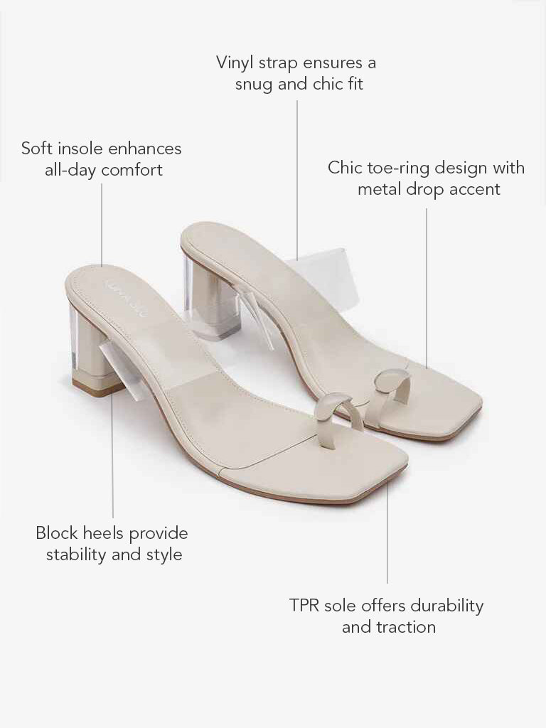 These ivory high heels by Luna Blu showcase a stylish toe-ring design. adorned with a metal drop accent for a touch of elegance. The vinyl strap on the upper ensures a secure fit. while the soft insole and sturdy outsole provide lasting comfort and stability.