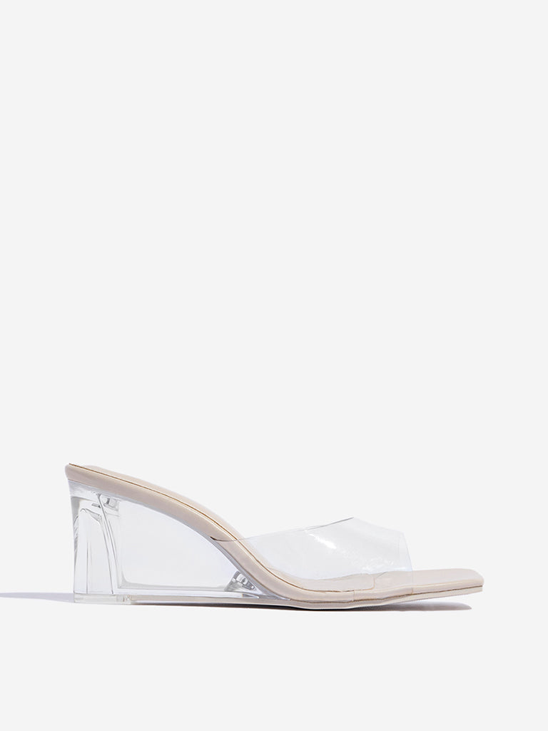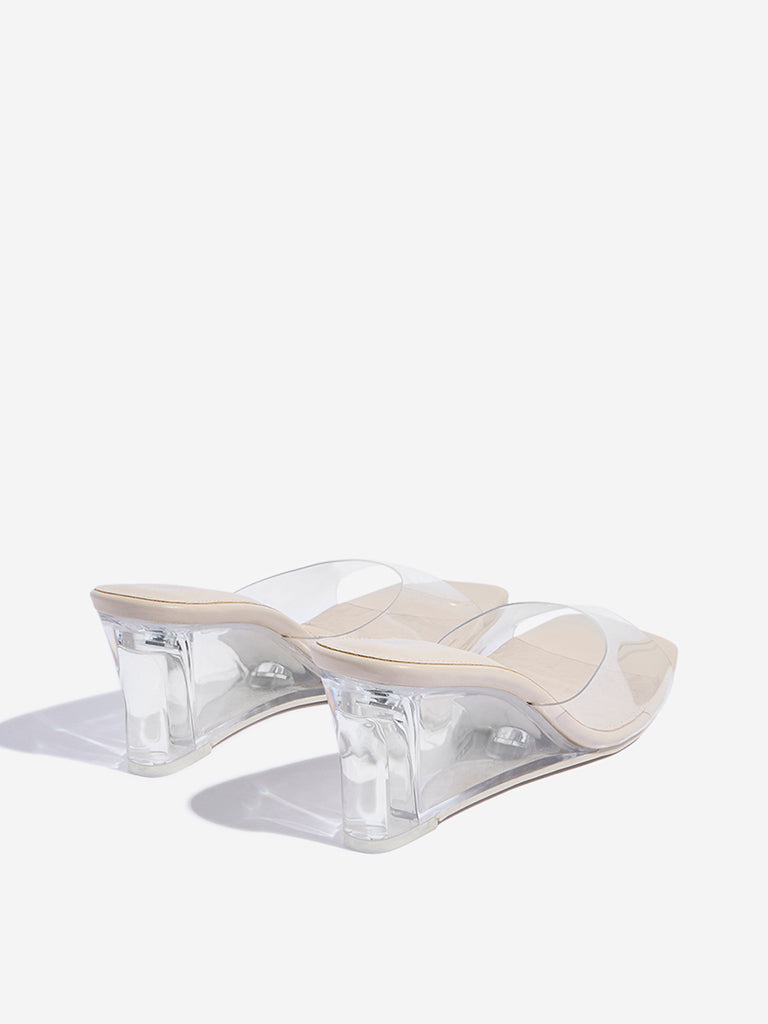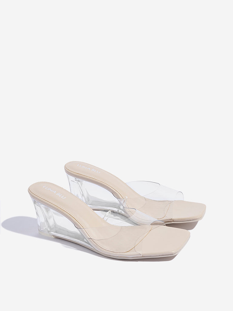 Luna Blu presents these ivory sandals featuring sleek vinyl straps and wedge heels. A cushioned footbed and a textured outsole complete the standout style. making them a must-have for any contemporary wardrobe.