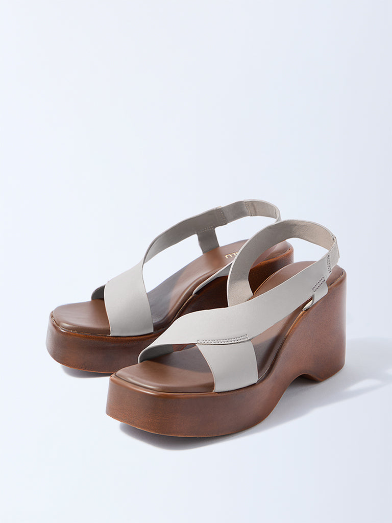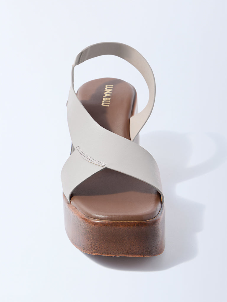 Bring a touch of summer style to your look with these ivory sandals from Luna Blu. featuring an elegant asymmetrical strap design. Set on a rich wooden platform for enhanced grip and finished with a soft insole for lasting comfort. they balance warm-weather ease with effortless sophistication.