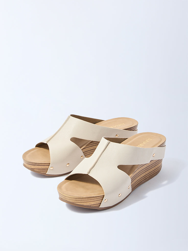Step into effortless sophistication with these ivory sandals from Luna Blu. Styled with wide straps for a contemporary look. they feature gold-toned rivets and a sculpted wedge sole for added height. A cushioned insole ensures all-day comfort.