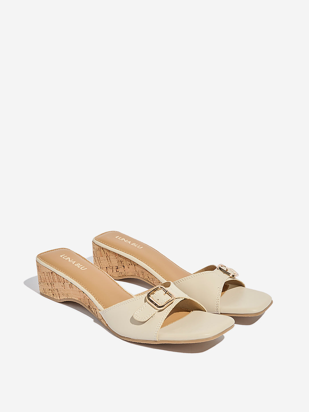 Step into effortless style with these ivory sandals from Luna Blu. Designed with a broad strap and finished with a striking gold-toned buckle. they exude understated sophistication. The comfortable wedge heel. styled with a cork-like texture. adds subtle height while ensuring all-day stability.