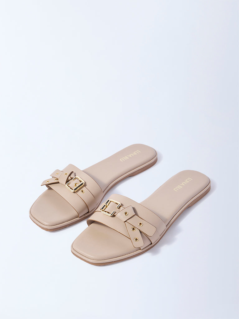 Step into modern sophistication with these beige slides from Luna Blu. Crafted with a square toe. the design features a wide strap accented with polished gold-tone buckles. The flat sole offers comfort. while the versatile hue makes them easy to pair with everything from summer dresses to tailored separates.