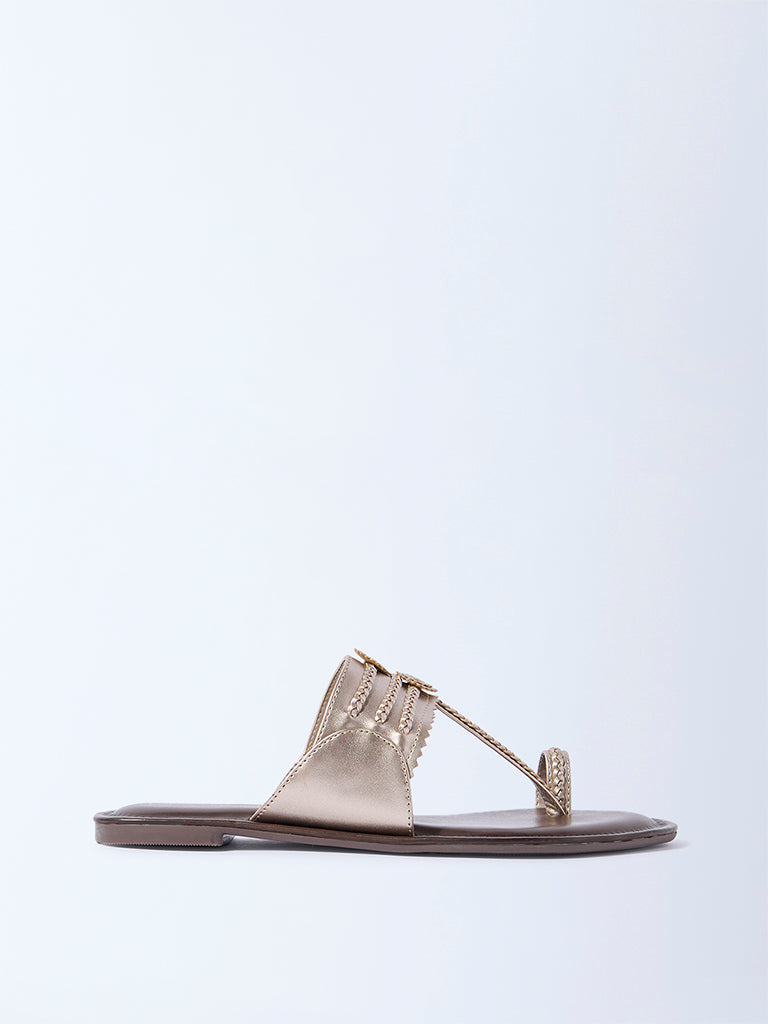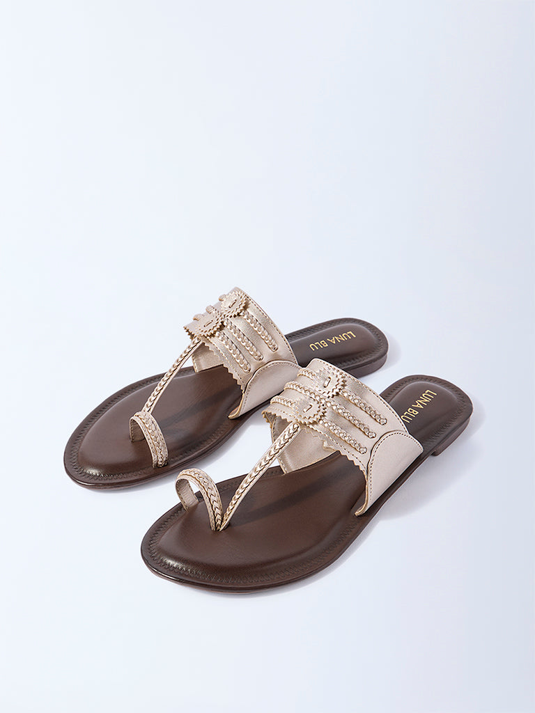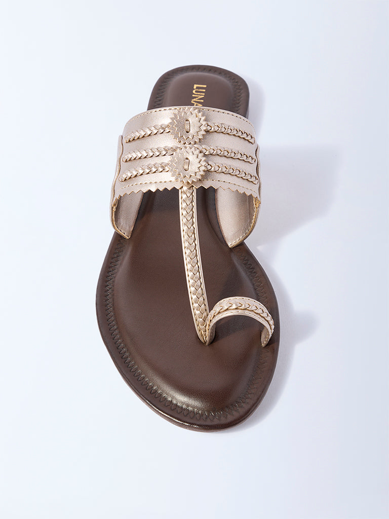 Celebrate timeless craftsmanship with these Kolhapuri-inspired sandals from Luna Blu. Styled with braided straps and a classic toe ring. the pair is finished in light gold for a subtle shine that complements both festive wear and everyday outfits.
