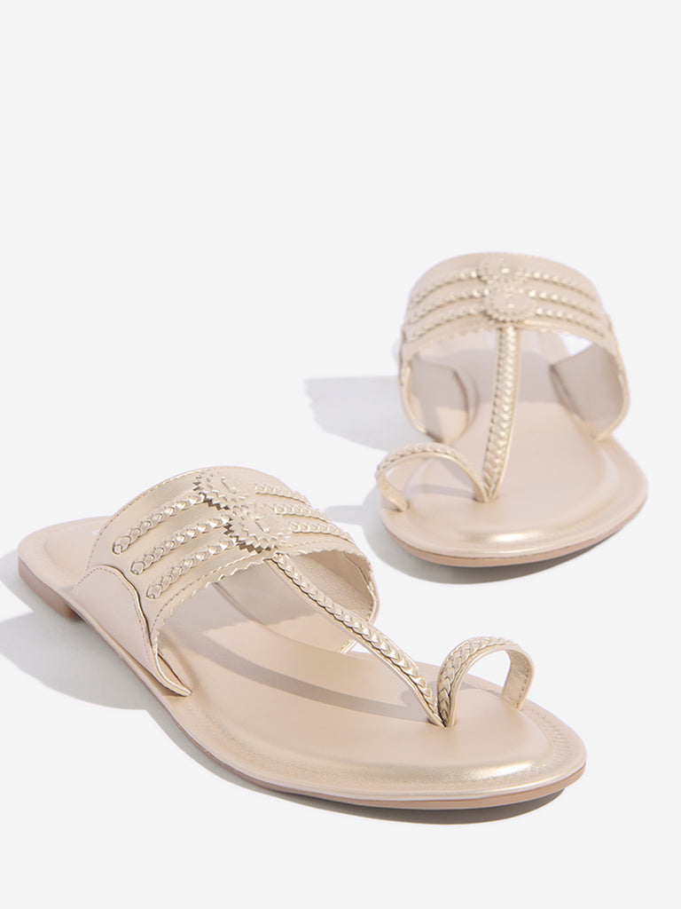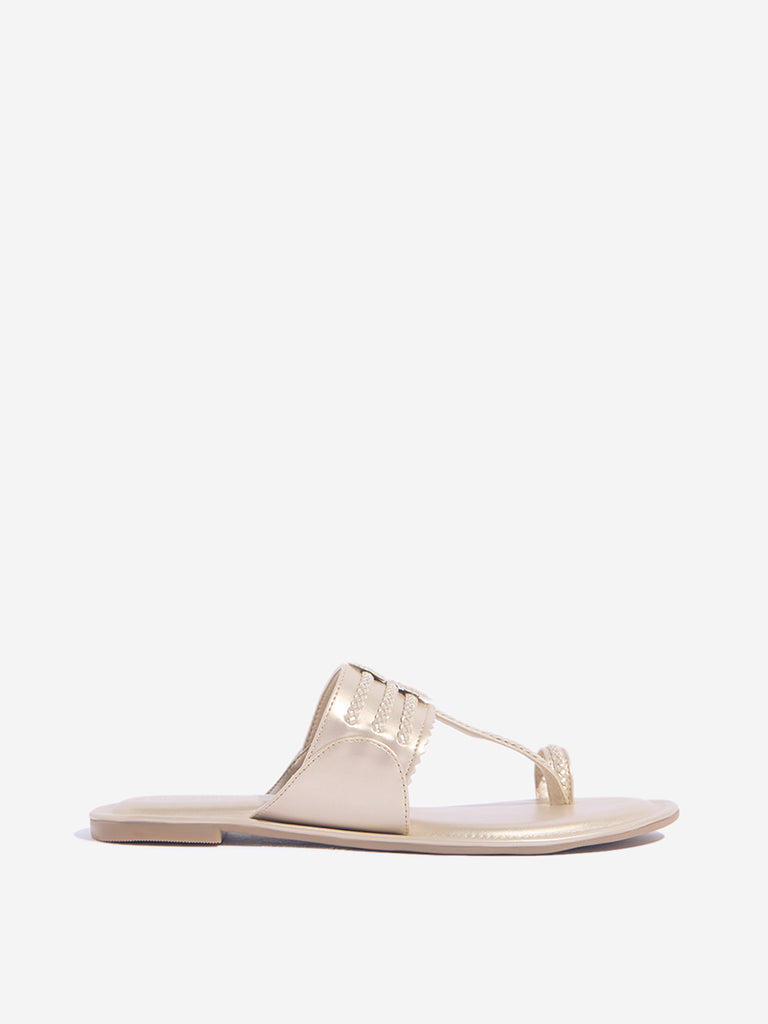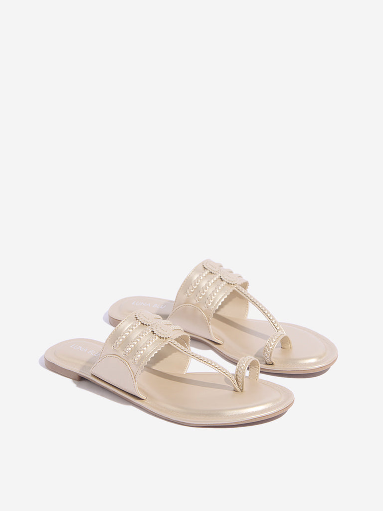 These light gold Kolhapuri sandals from Luna Blu blend timeless tradition with a touch of shimmer. Designed in a classic T-strap silhouette with a toe-ring and intricate braided accents. they bring elegance to everyday dressing. A padded insole promises lasting comfort. while the ridged outsole offers dependable grip.