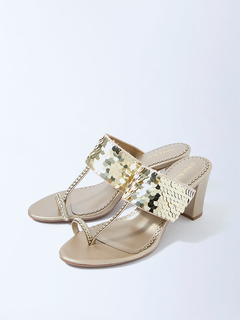 Make a dazzling impression with these light gold Kolhapuri sandals from Luna Blu. defined by a broad sequin-embellished strap and a braided toe-ring strap for added detail. Resting on a sturdy heel. the pair is finished with a soft footbed for lasting comfort and a textured outsole for steady grip. making it an elevated choice for festive dressing.