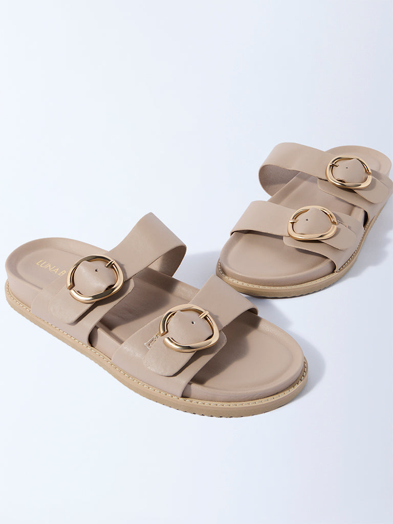 These light taupe slip-on sandals from Luna Blu strike the perfect balance between ease and elegance. Designed with dual straps accented by gold-toned buckles. they bring a touch of polish to their understated silhouette. The tonal cushioned footbed ensures all-day comfort. while the textured outsole offers dependable grip with every step.