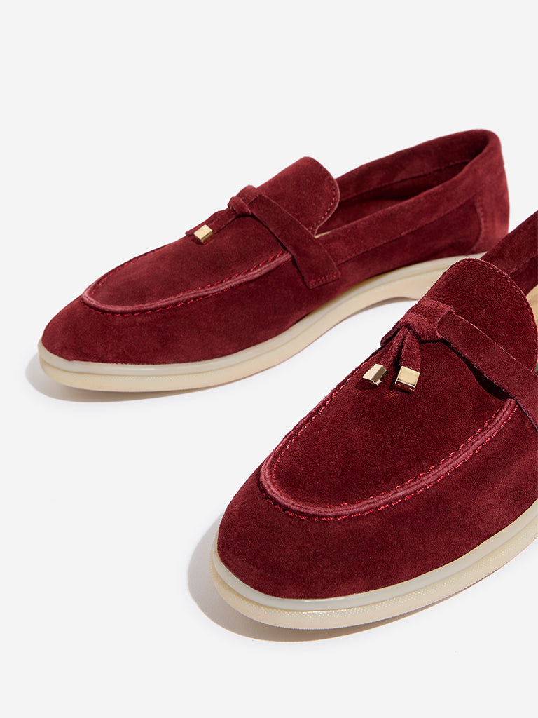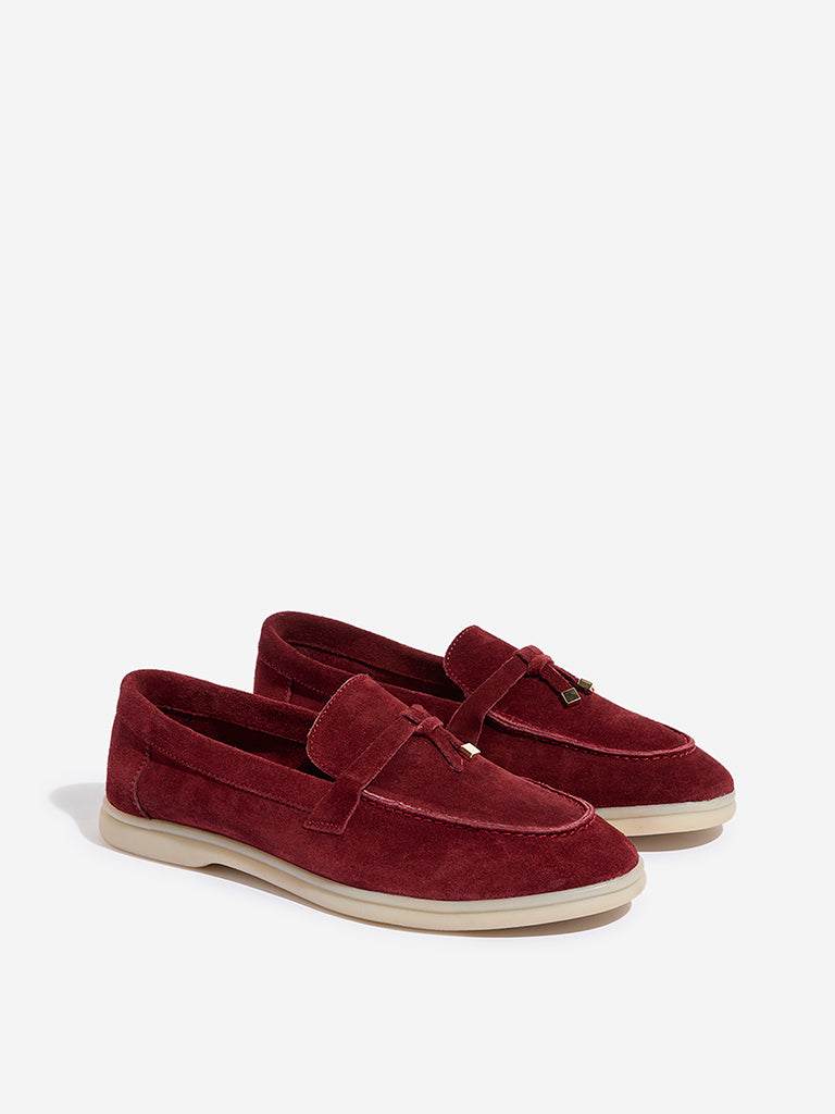 Add a touch of refined charm to your footwear collection with these penny loafers from Luna Blu. The rich maroon hue paired with the soft suede finish creates a luxurious look. perfect for both formal and smart-casual occasions. With a classic penny slot and cushioned interior. these loafers offer timeless style and all-day comfort.
