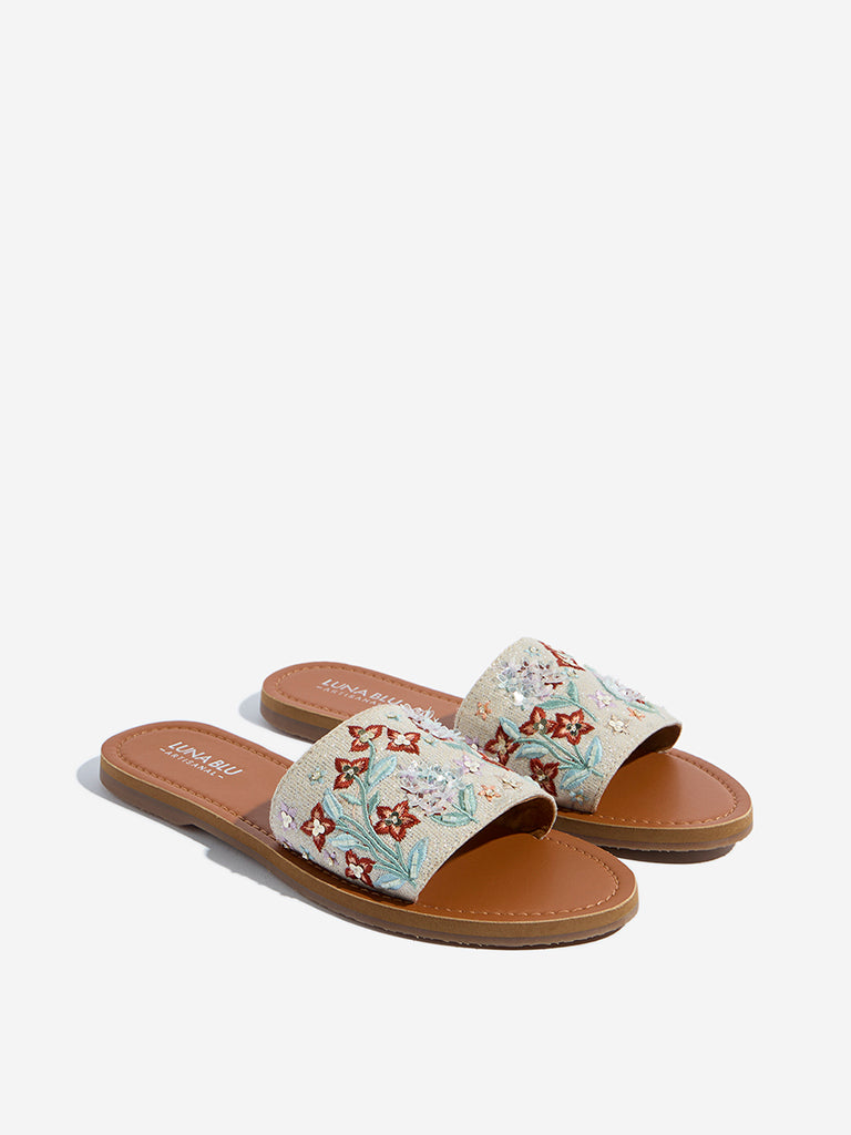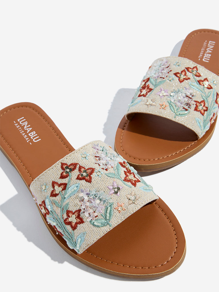 Bring artisanal flair to your look with these multicolour slides from Luna Blu. Set on an earthy base. they are fashioned with a wide strap adorned with vibrant embroidery for a handcrafted touch. The cushioned insole ensures comfort. while the textured outsole offers added grip.