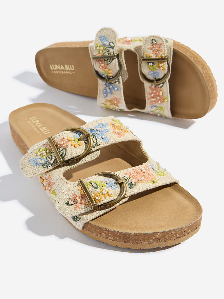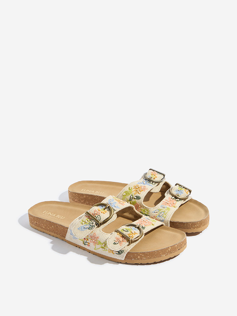 These multicolour sandals from Luna Blu feature broad straps embellished with vibrant floral embroidery and a dual-strap design with adjustable gold-toned buckles. Set on a contoured cork midsole with a cushioned footbed. they promise day-long comfort. while the ridged outsole offers dependable grip.
