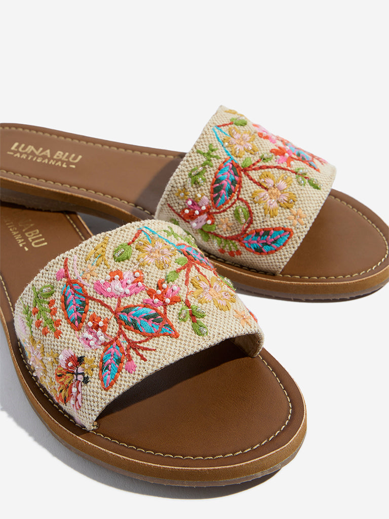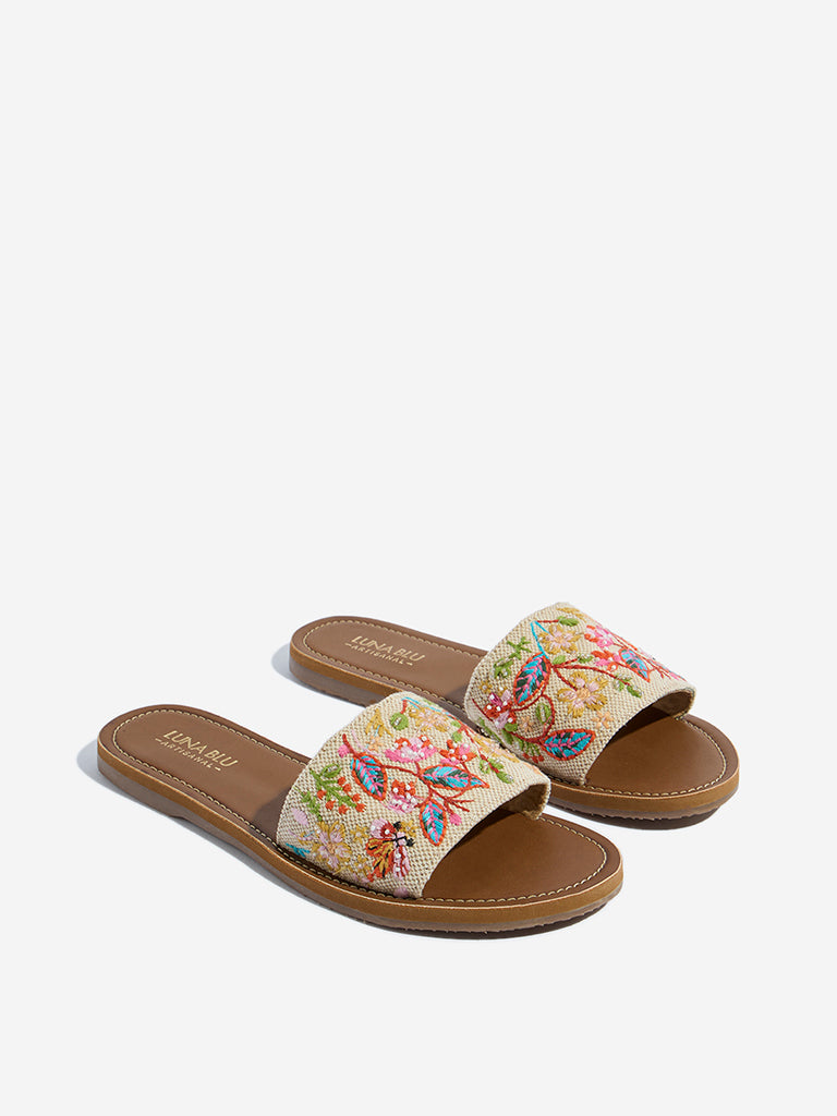 Breathe new life into your warm-weather wardrobe with these multicolour slides from Luna Blu. Set on a neutral base. they feature a wide strap adorned with delicate floral embroidery for a charming finish. The soft insole ensures comfort with every step. while the textured outsole offers added grip.