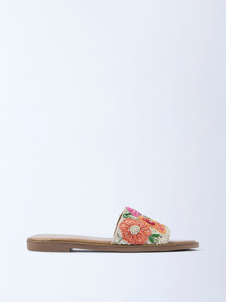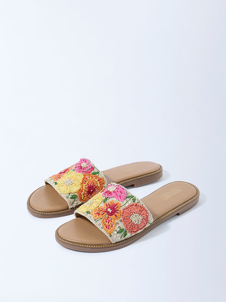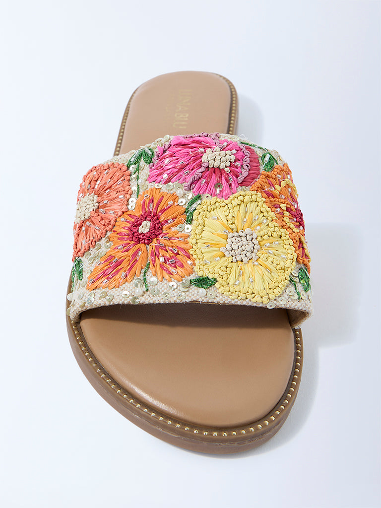Bring a burst of multicolour to your look with these slides from Luna Blu . detailed with vibrant floral embroidery across the broad strap. Set on a flat base. the pair is finished with a soft insole for comfort and a textured outsole for steady grip. A playful yet refined choice. perfect for adding charm to daytime dressing.