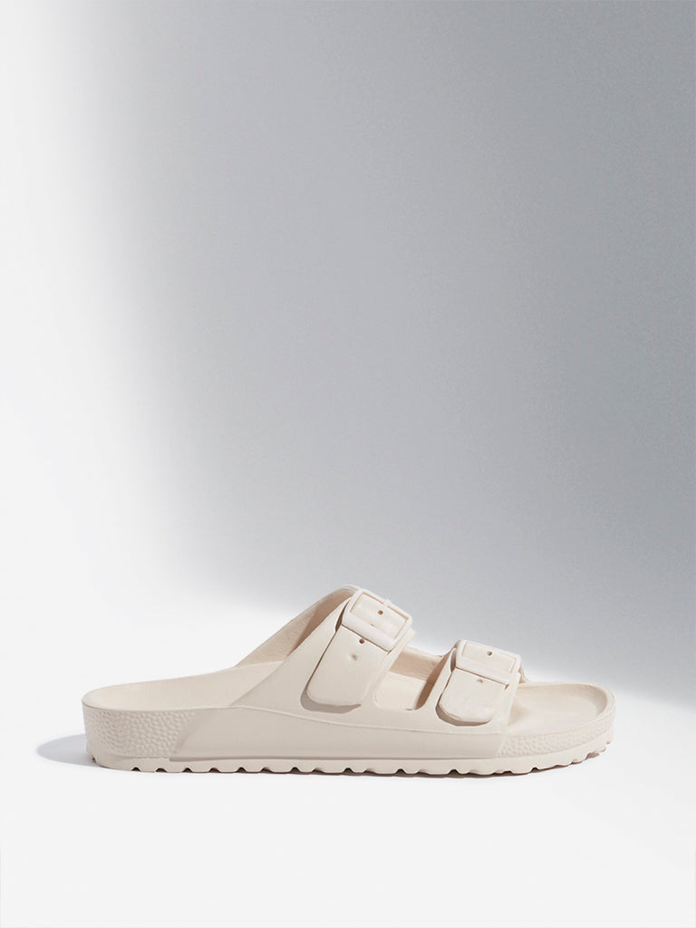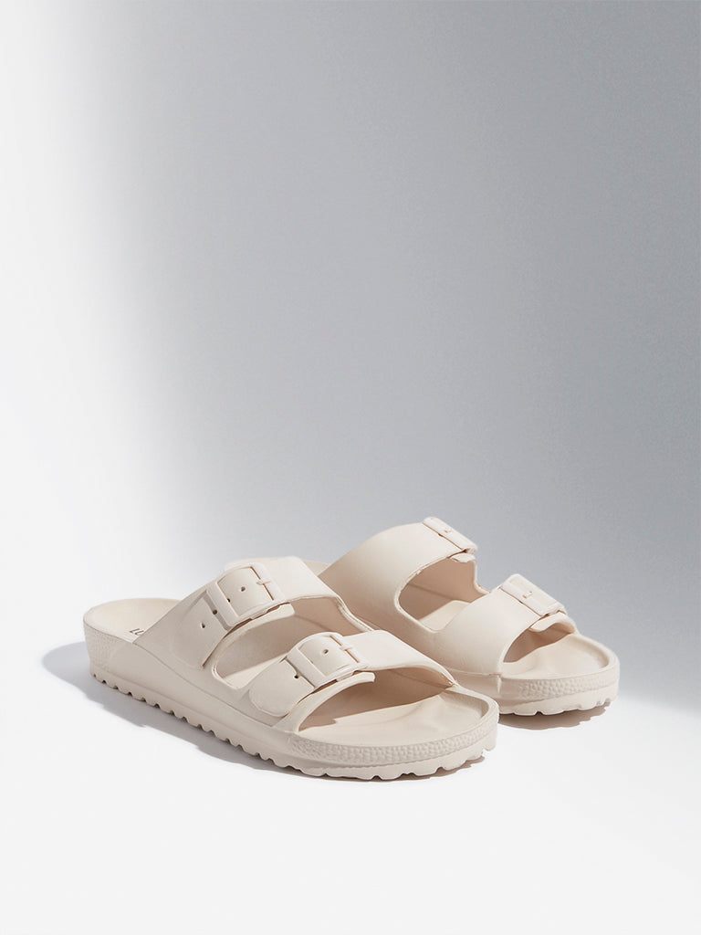 Luna Blu introduces these off-white comfort flip-flops. designed with dual buckled straps for a secure and firm grip. Featuring a cushioned footbed and ridged outsoles. they provide maximum traction and comfort.