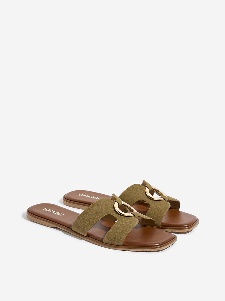 LUNA BLU Olive Cut-Out Detailed Buckled Slides
