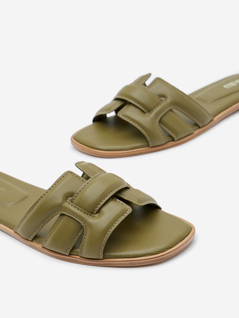 Luna Blu presents these olive slides with cushioned multi strap-dealing in the upper. The footwear offers a comfortable walking experience through fluffy and soft insole and textured outsole.