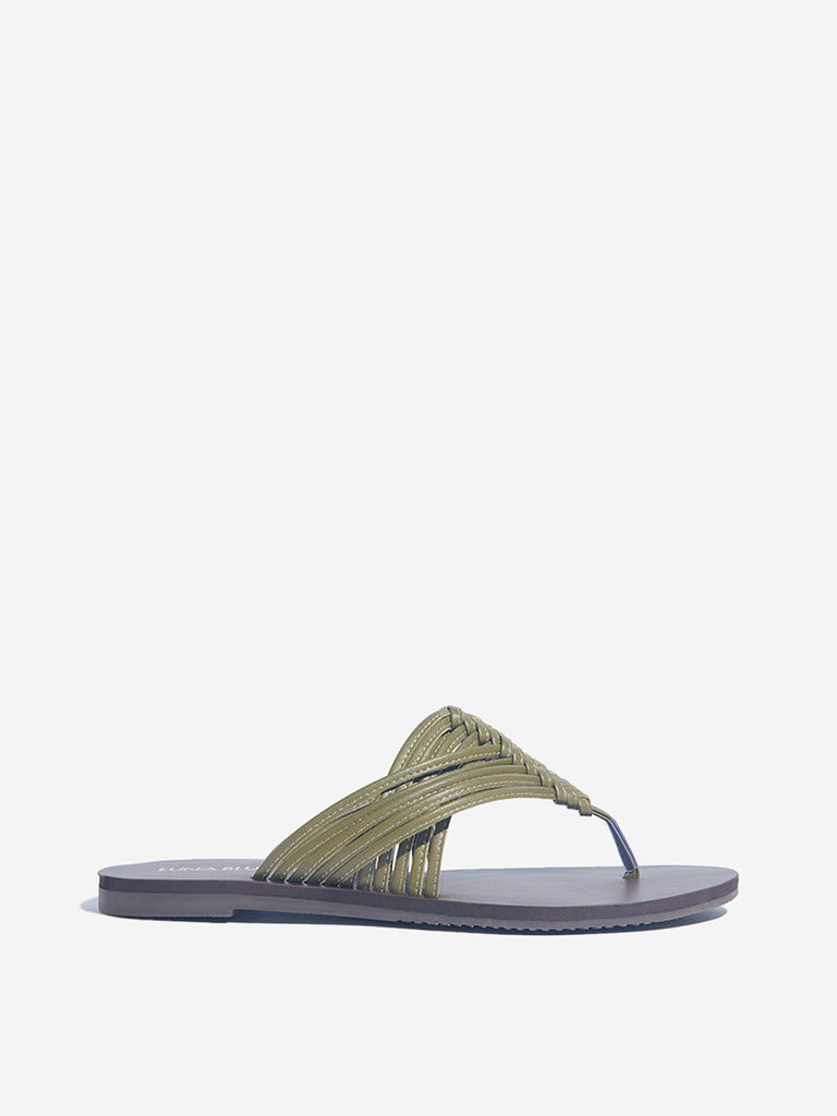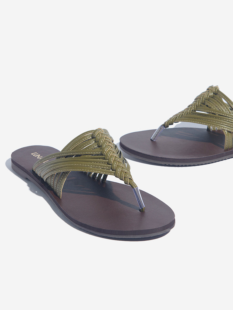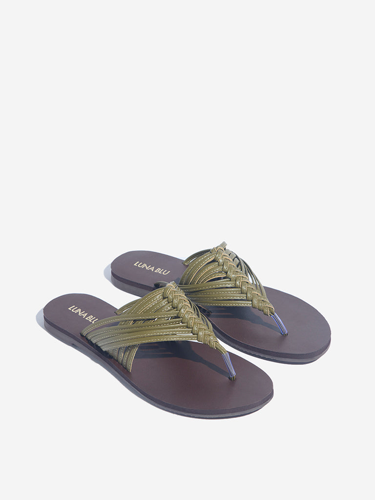Luna Blu presents these olive sandals. featuring interwoven straps that create a textured thong design across the foot. Set on a soft footbed for lasting comfort. this pair is grounded by a textured outsole that ensures steady traction. making them a fresh. easy-going choice for everyday styling.