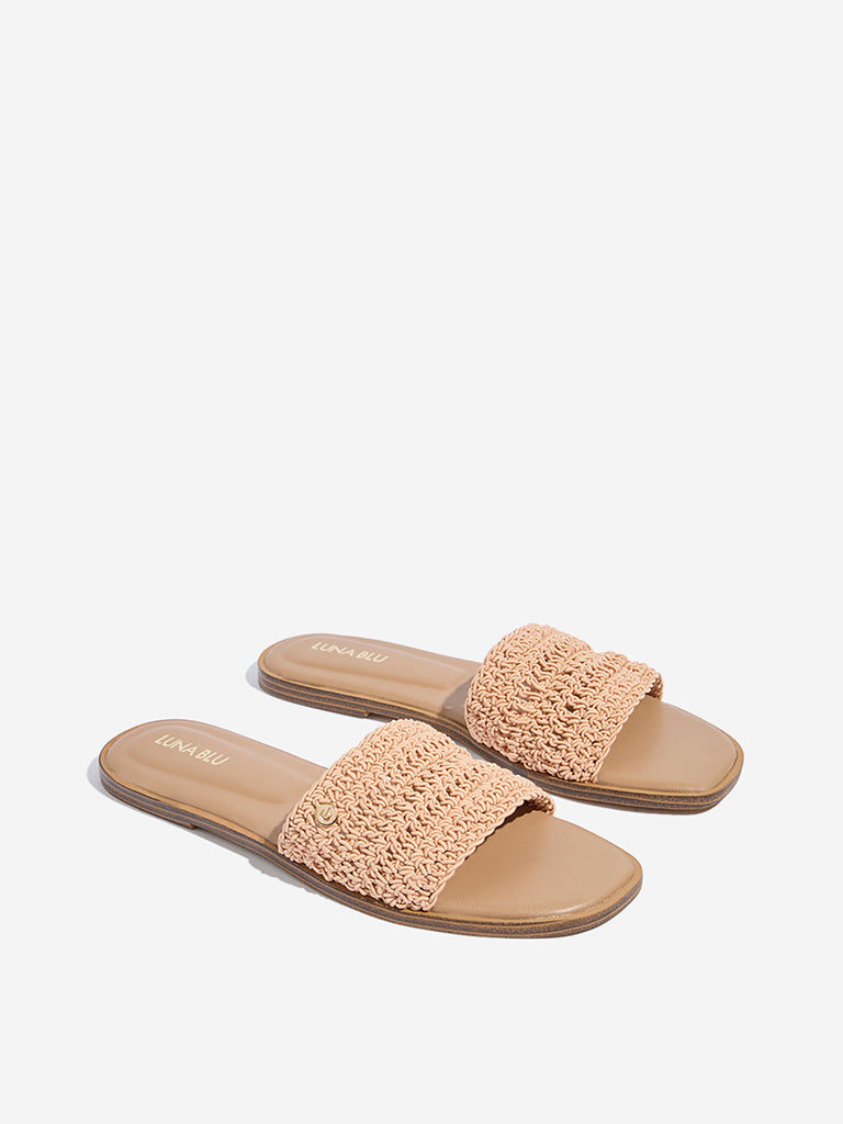 These peach slides from Luna Blu showcases an intricately woven strap. offering handcrafted charm. A cushioned footbed provides lasting comfort. and the textured outsole ensures a steady grip with every step.