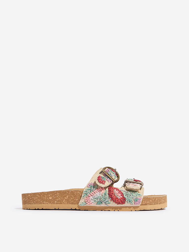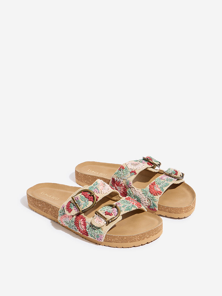 These pink slip-on sandals from Luna Blu showcases floral embroidery on the dual buckled straps. Built from durable materials. they come fitted with a cushioned footbed and textured outsoles for a comfortable walking experience.