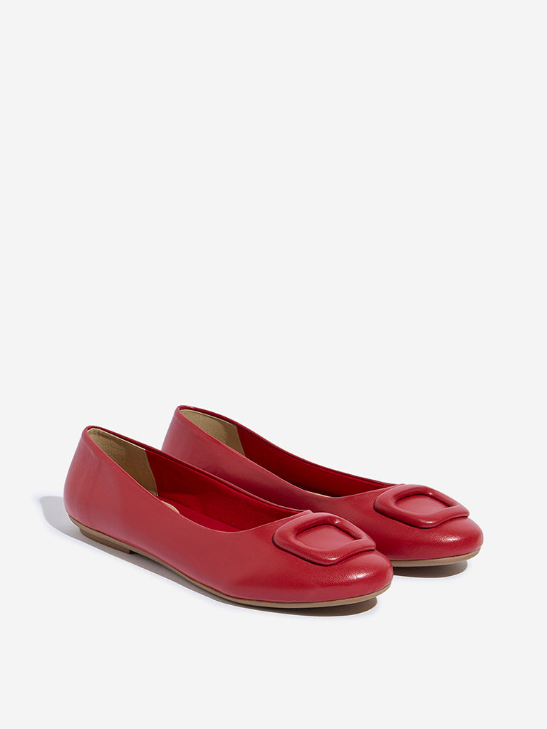 Luna Blu presents these red ballerina. as a striking blend of elegance and comfort. Featuring a sleek design with a statement metallic buckle on the upper. these ballerinas add a pop of colour to any outfit. The soft insole ensures all-day comfort. while the sturdy outsole provides reliable durability. Perfect for workdays or casual outings. these shoes are a versatile addition to your wardrobe.