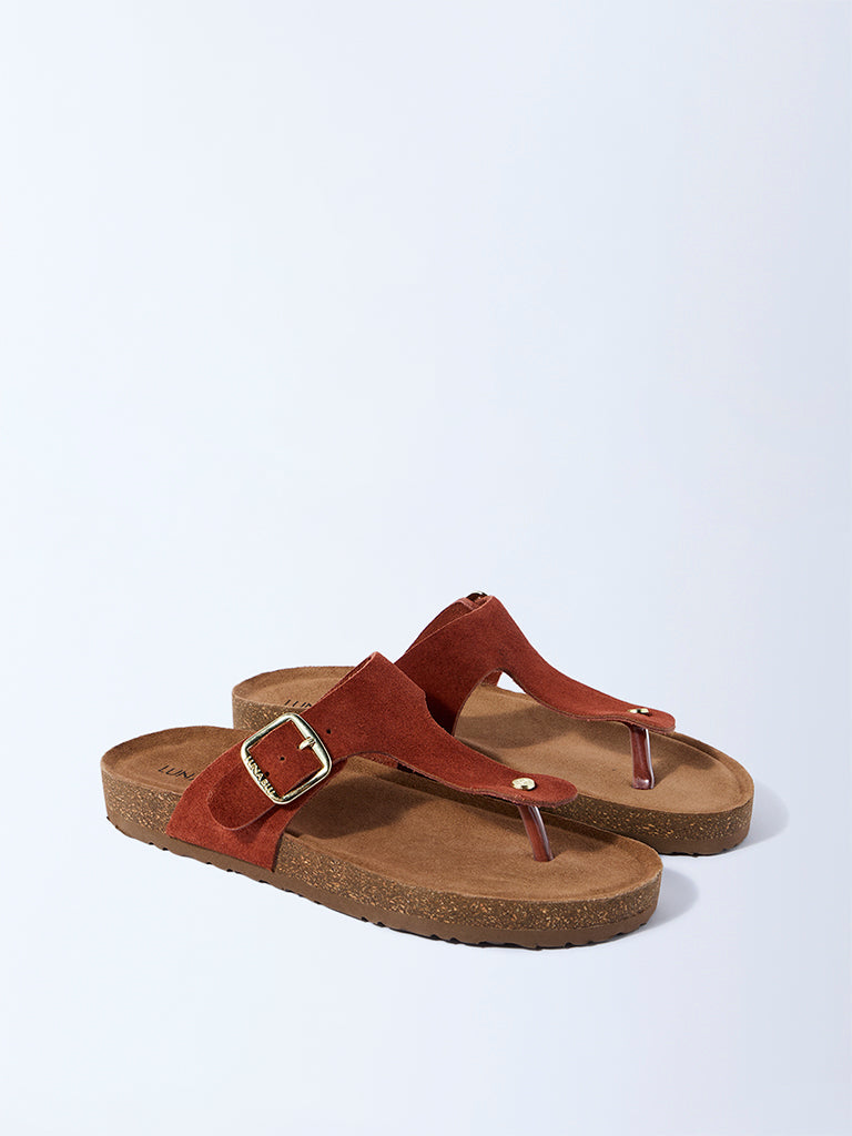 These rust-toned sandals from Luna Blu bring an earthy vibrance to everyday dressing. Crafted in faux suede. the T-strap silhouette is accented with a polished buckle for a refined touch. The contoured footbed offers day-long comfort. while the cork-textured midsole adds a natural finish.