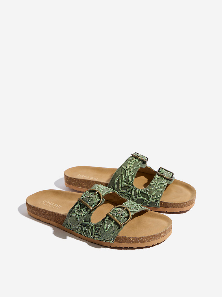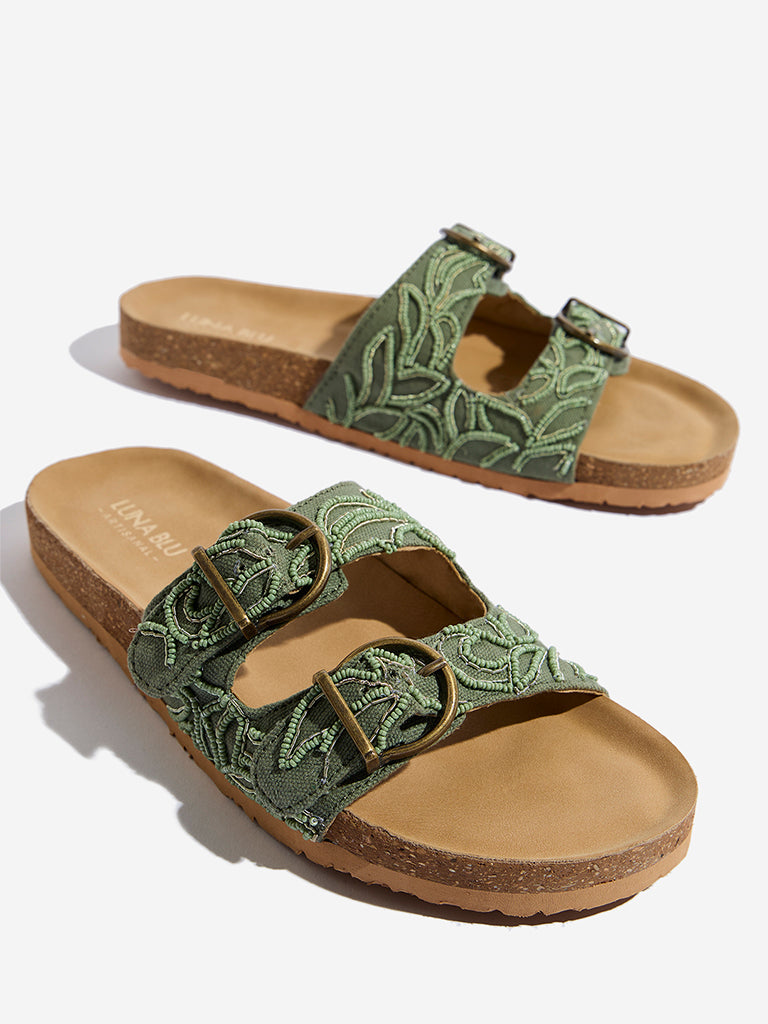 Luna Blu presents these stylish sage sandals. featuring dual buckled straps adorned with delicate beads for a chic touch. Designed for comfort. the slip-on pair comes with a cushioned insole. a cork-like midsole. and a textured outsole for a sturdy grip.