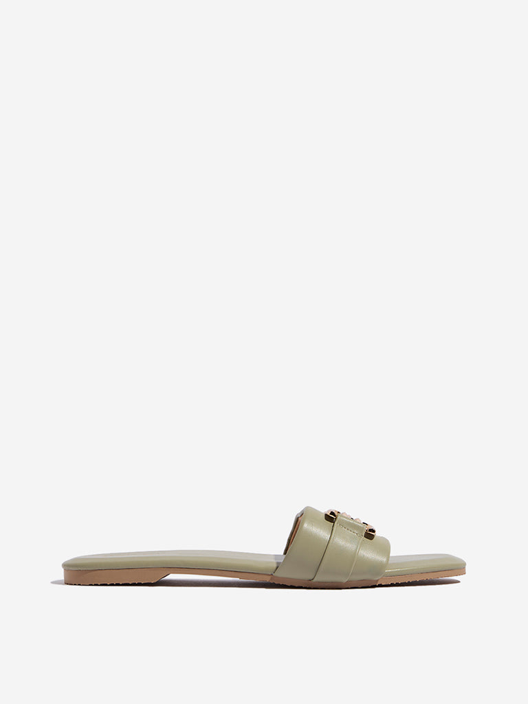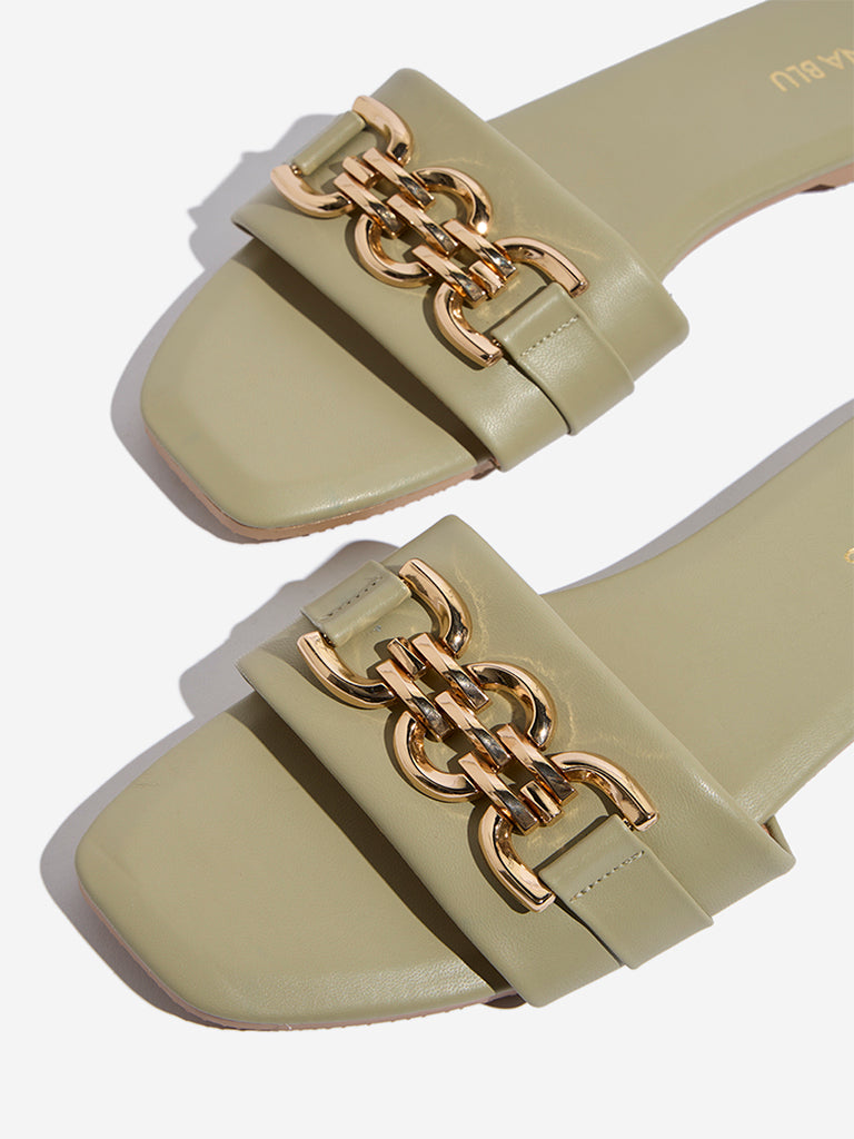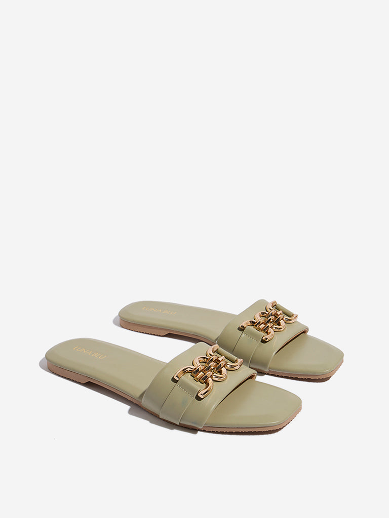 These sage slides from Luna Blu feature sleek straps adorned with a gold-toned chain detail. adding a refined edge to their minimalist design. The cushioned footbed ensures lasting comfort. making them a perfect blend of style and ease for any occasion.