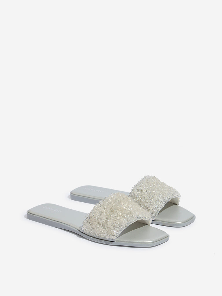 Luna Blu presents these silver slides. featuring a crystal-embellished band on the upper for a touch of sparkle. Stylish and comfortable. these slides are perfect for adding a chic. modern twist to your wardrobe.