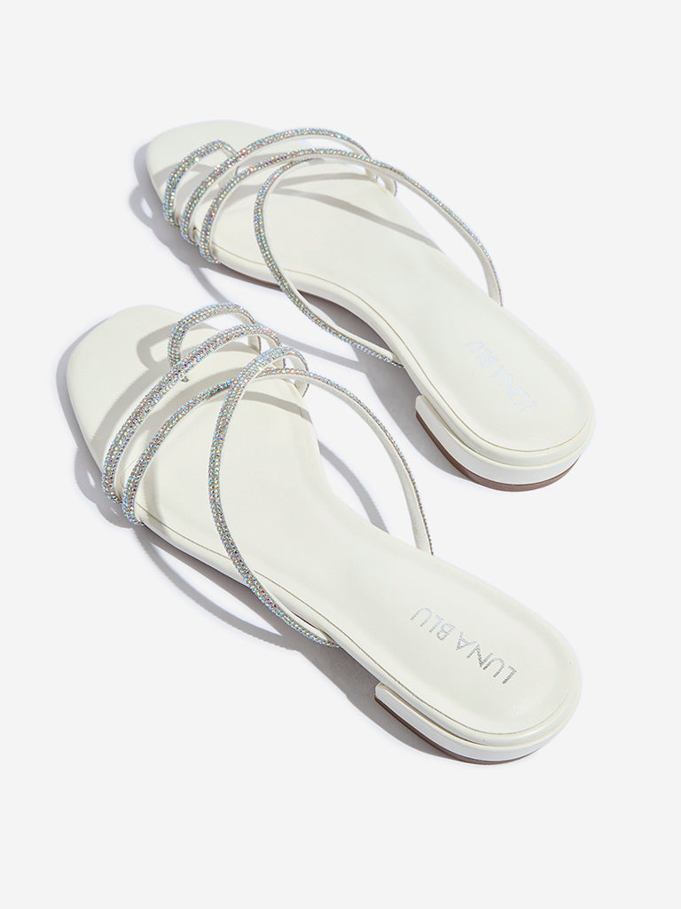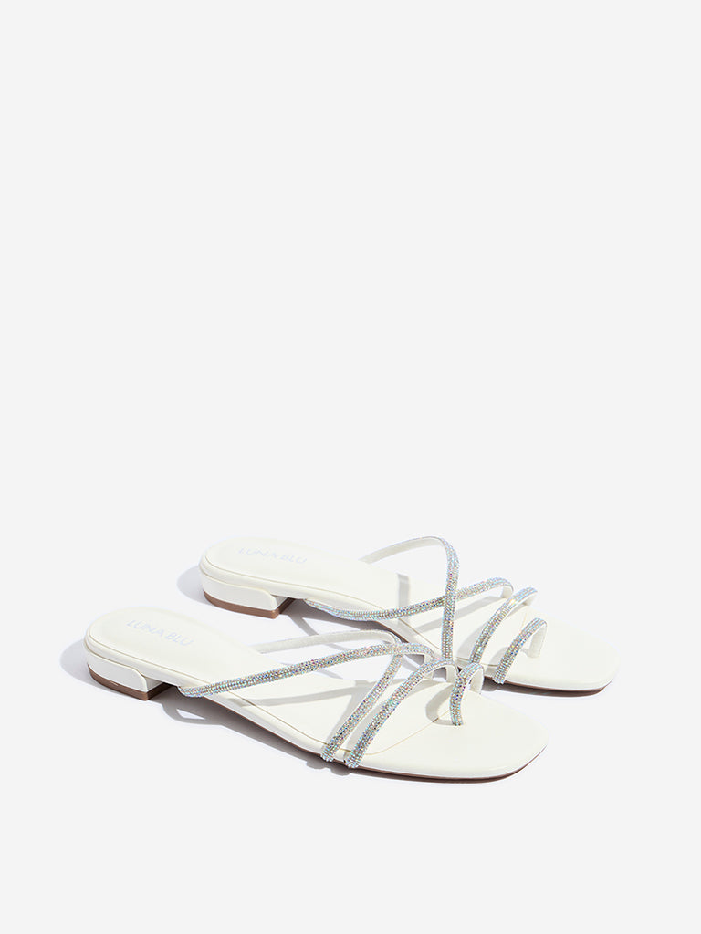 These Silver slides from Luna Blu showcase an asymmetrical multi-strap design. embellished with sparkling diamantes for a refined touch from Luna Blu. The toe ring detail adds both style and support. while the soft insole and durable low-heel outsole provide lasting comfort.