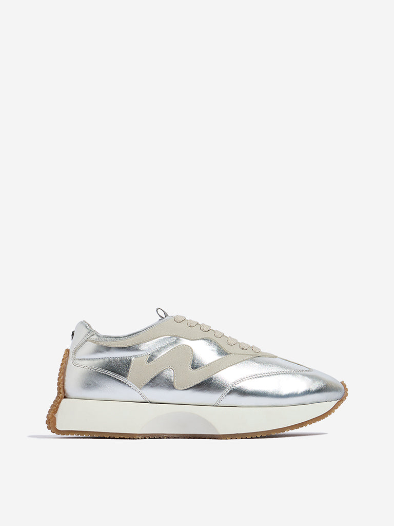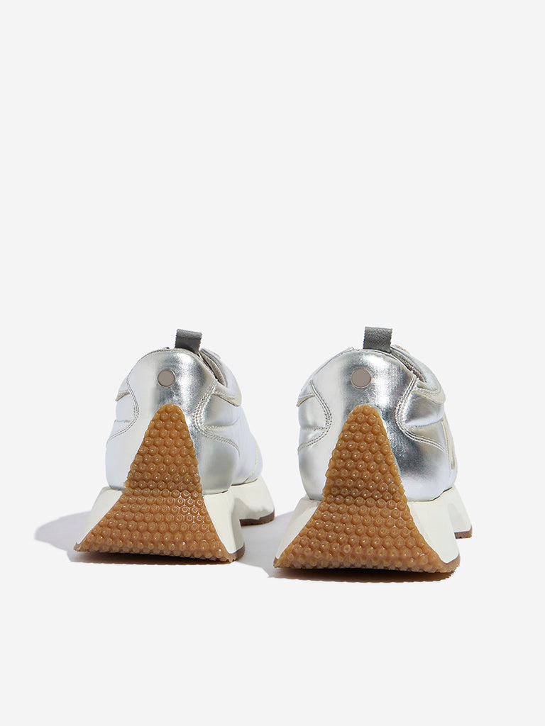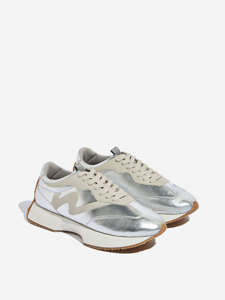 Luna Blu presents these silver sneakers. featuring panel-stitched detailing on the exterior for a sleek and sophisticated look. The lace-up design ensures a secure and personalized fit. while the soft insole provides all-day comfort. The high-sole outsole. with its textured build. offers superior grip. making these shoes the perfect balance of style. comfort. and practicality for any occasion.