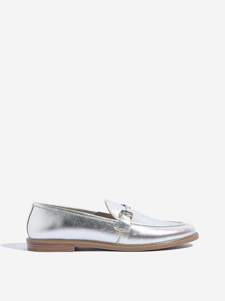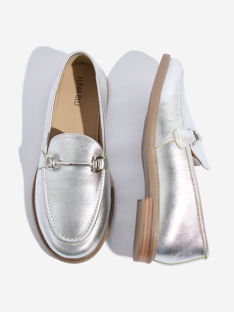 Lend your everyday footwear range a style refresh with these silver loafers from Luna Blu. Accentuating a hardware detailing on the vamp for added chicness. these glossy shoes come fitted with a cushioned footbed and textured outsoles for a comfortable walking experience.