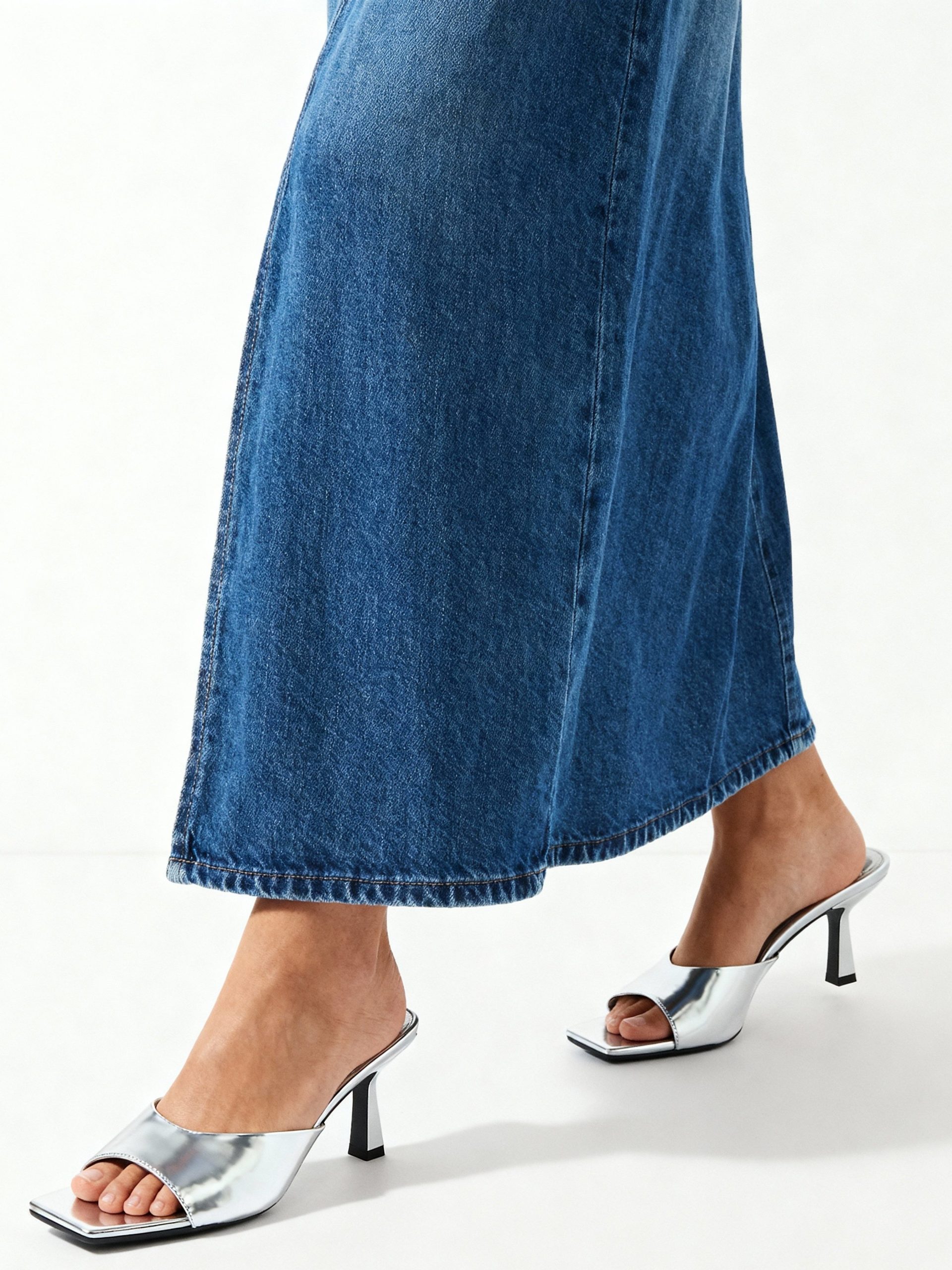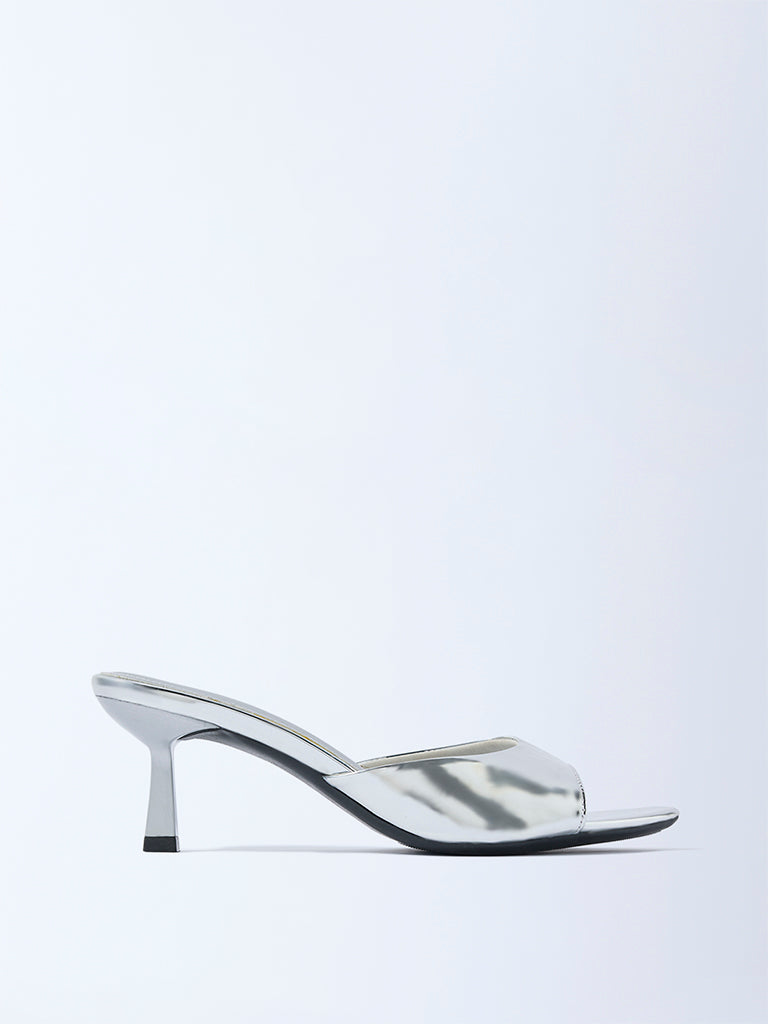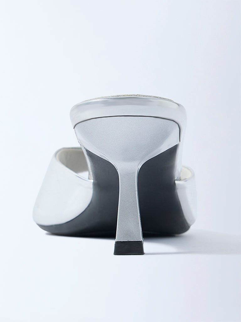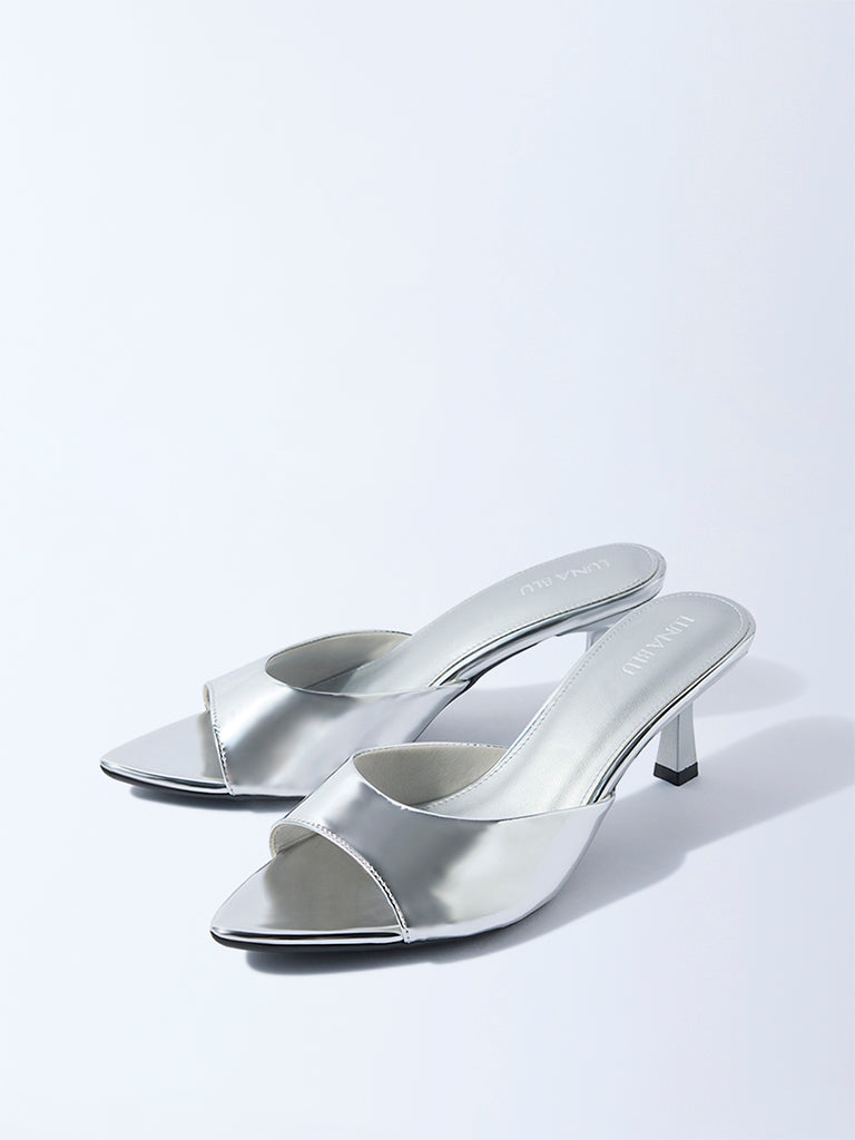 Luna Blu brings these silver sandals designed for a sleek. contemporary aesthetic. The high-shine metallic makes an instant statement. while the slim mid-heel lends height without compromising ease. Thoughtfully designed with a soft footbed and secure outsole grip. these mules are perfect for parties. soir??es. ensuring all-day wearability while keeping a modern appeal.
