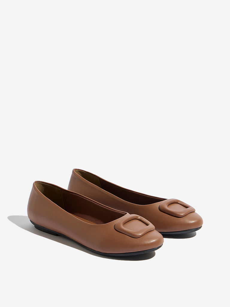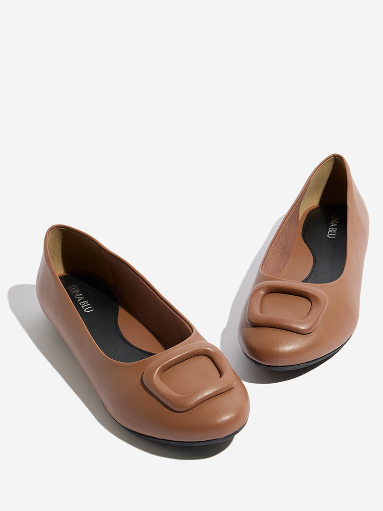 Luna Blu presents these tan ballerinas. featuring a sleek silhouette with a stylish buckle on the upper. Designed with a soft insole. low heel. and textured outsole. they offer both comfort and a touch of elegance.