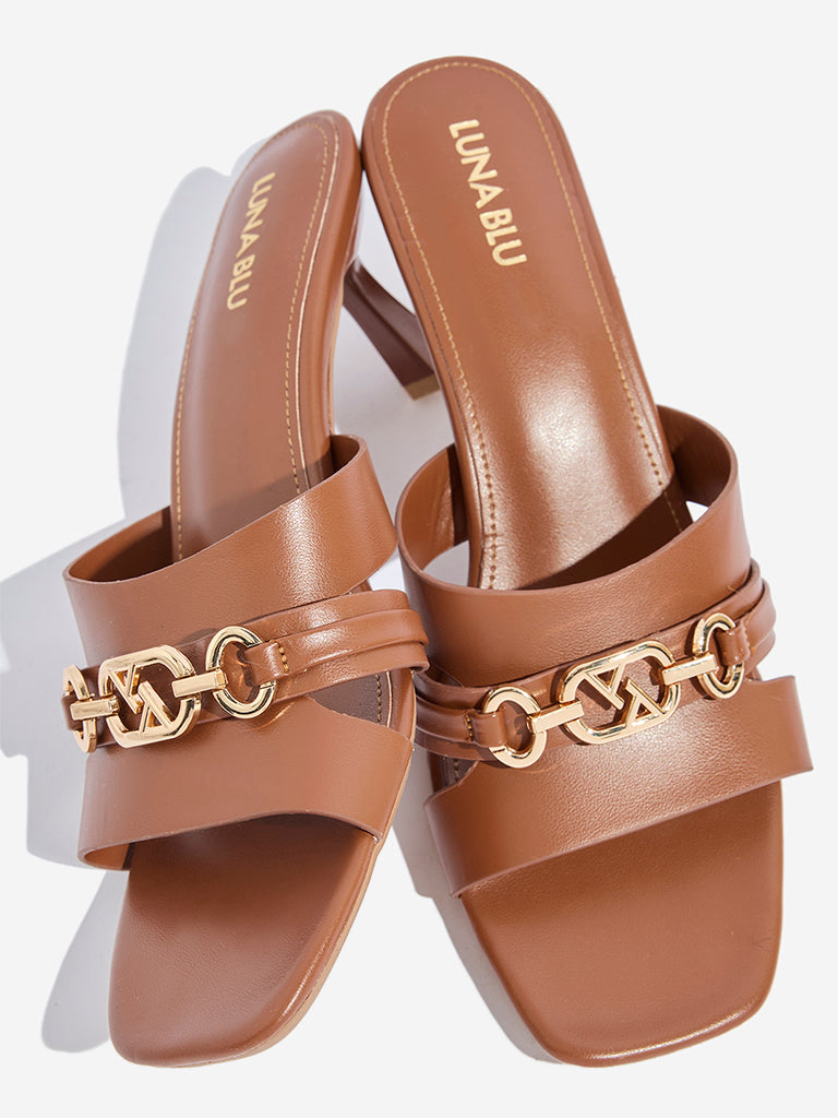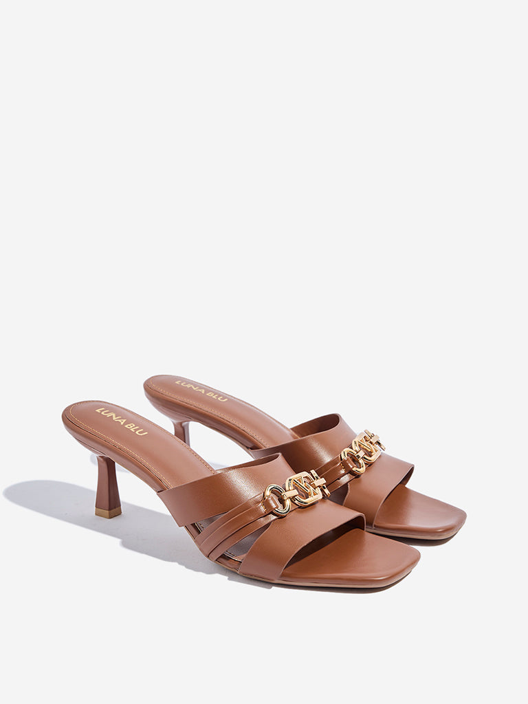 Refined and versatile. these tan sandals from Luna Blu are a timeless addition to your dress rotation. Featuring a broad strap that elegantly secures the foot and a slender stiletto heel for poised lift. they’re accented with intricate chain detailing for just the right amount of shine.