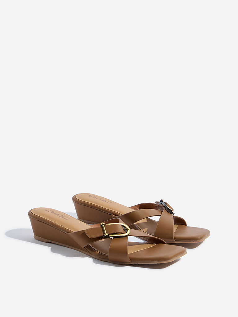 These tan heel sandals from Luna Blu bring effortless charm with their criss-cross strap design and gold-toned buckle accent. Set on a comfortable wedge heel. they offer a hint of lift. while the cushioned insole and textured outsole deliver all-day ease and stability.