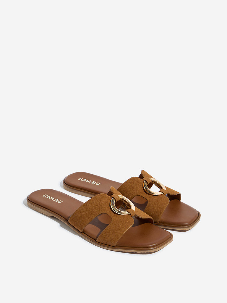 Luna Blu presents these tan slides. showcasing a cut-out detailed upper accentuated with a gold-toned round buckle at the center. Crafted with a soft insole and a sturdy outsole. they are the perfect blend of elegance and comfort for daily wear.