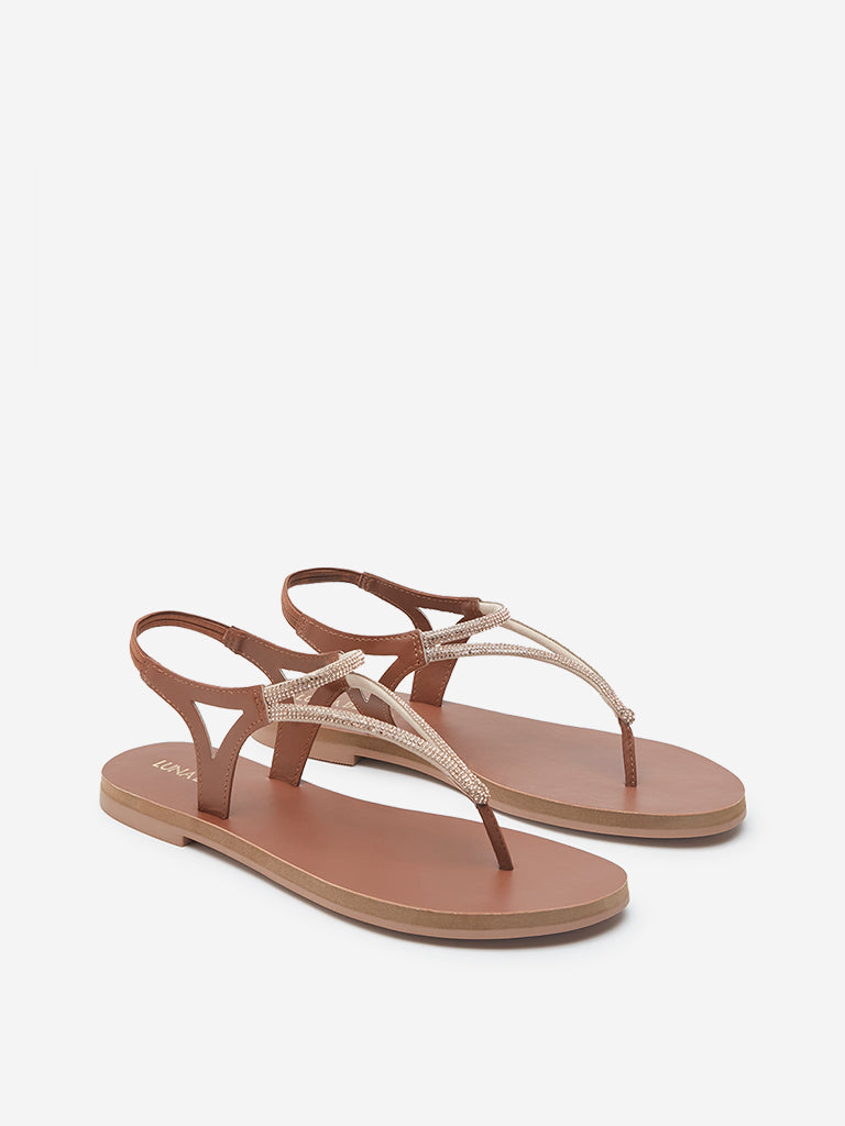 These tan sandals from Luna Blu are fashioned with diamant?? embellishments on the T-straps. Built from durable materials. they are fitted with a cushioned footbed and an ankle strap for a secure grip.