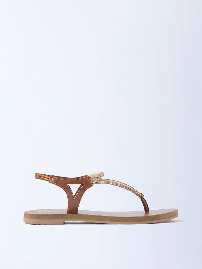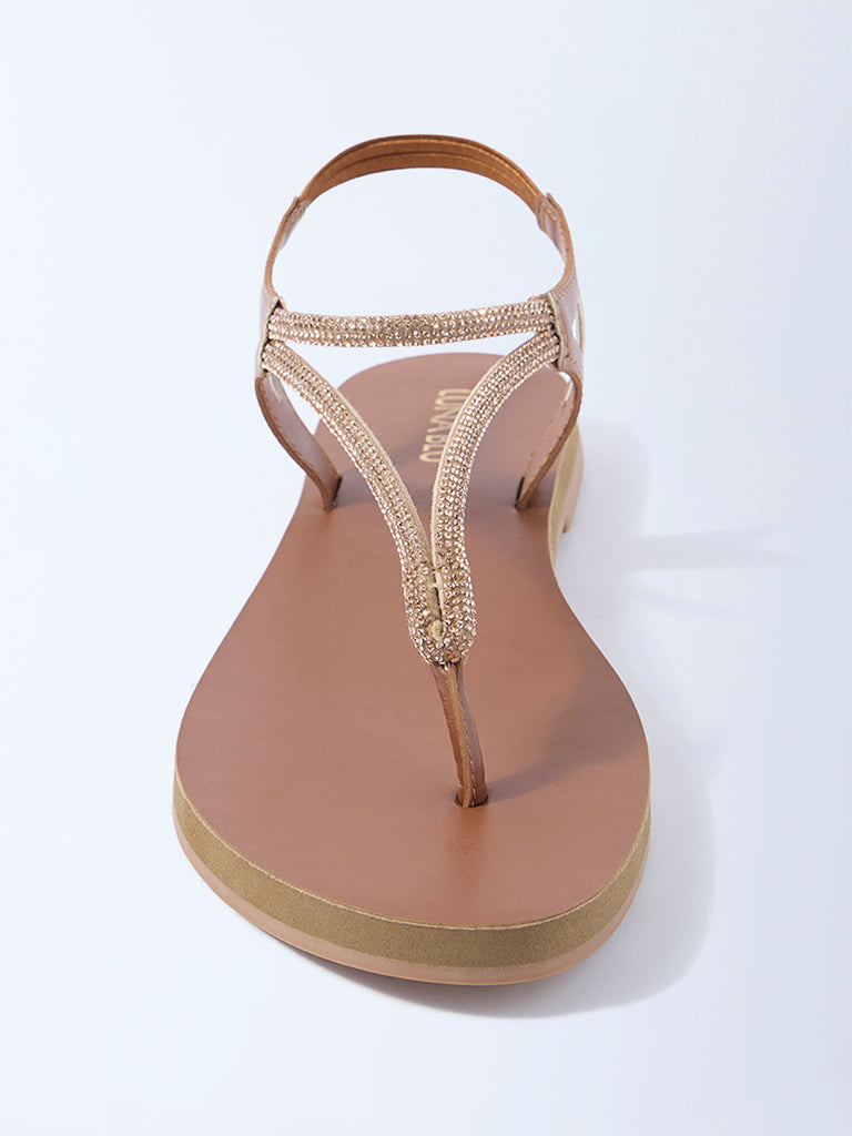 Luna Blu launches these tan sandals. crafted with slender straps adorned with embellishments for a refined sparkle. Set on a padded footbed for comfort. they are completed with a textured outsole that ensures reliable grip. A comfortable essential that merges everyday ease with understated elegance.