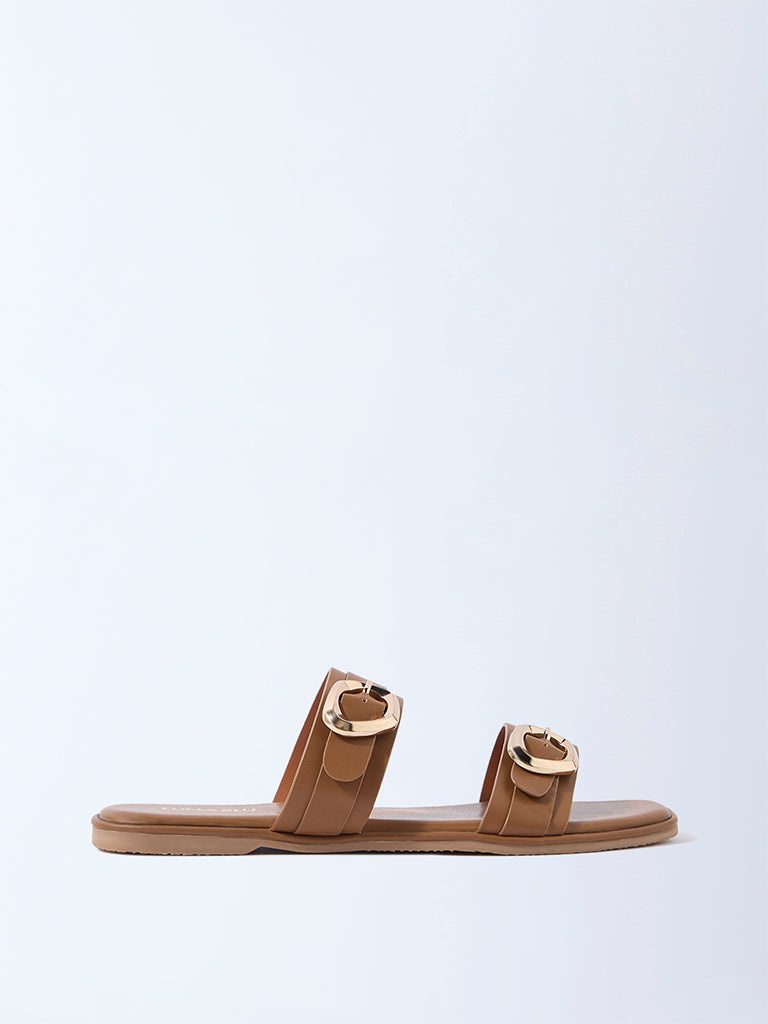 Elevate everyday dressing with these tan dual-strap sandals from Luna Blu. Detailed with oversized gold-tone buckles. they pair a sleek square toe with a rich monochrome finish for modern appeal. Comfortable yet chic. this versatile pair transitions effortlessly from daywear to casual evenings.