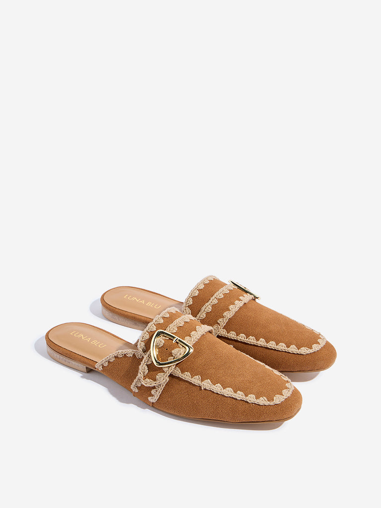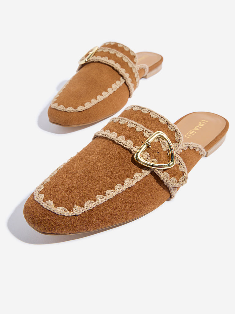 In a neutral tan shade. these mules from Luna Blu are designed with embroidery detailing and a gold-toned buckle for a chic twist. Built from durable materials. the slip-on pair comes with a smooth footbed and soft footbed for a comfortable walking experience.