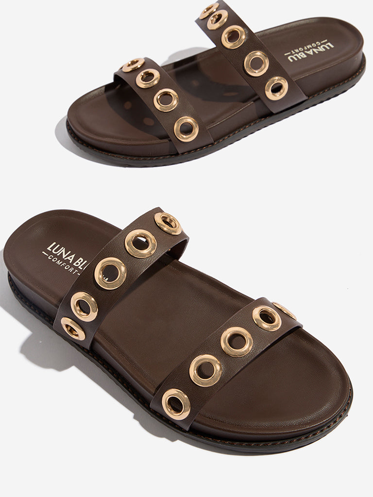 Showcasing eyelet detailing on dual straps. these tan comfort sandals from Luna Blu blend style with everyday ease. Designed for all-day wear. they feature a cushioned footbed for superior comfort and a textured outsole for enhanced grip and support.