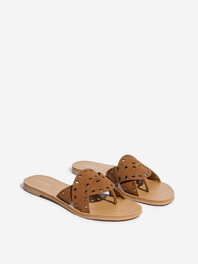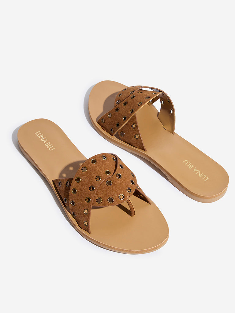 These tan slides from Luna Blu flaunt eyelet detailing on the multi-straps. Built from durable materials. they come fitted with a cushioned footbed and low-heels.