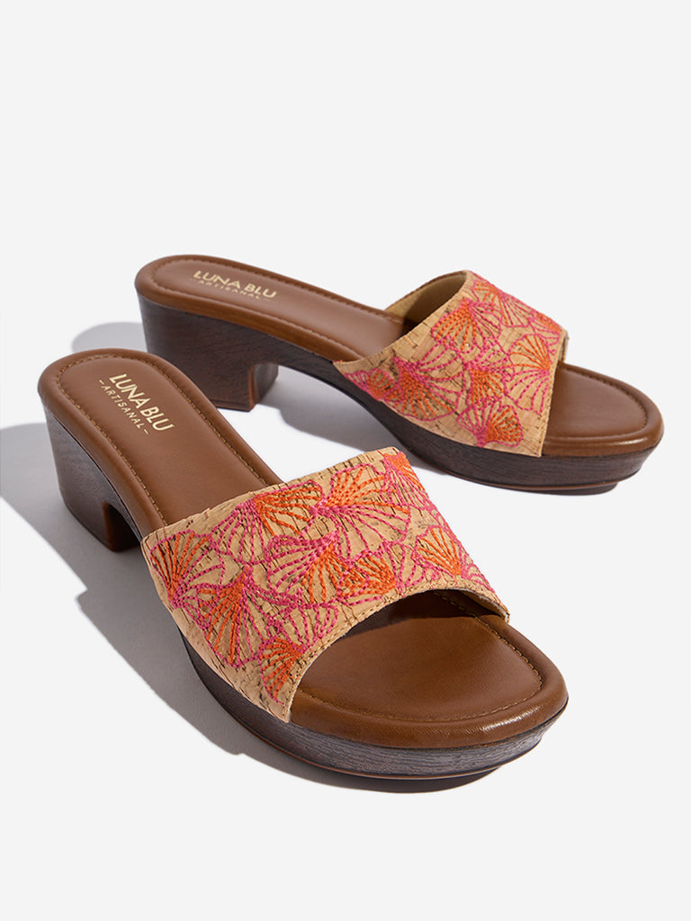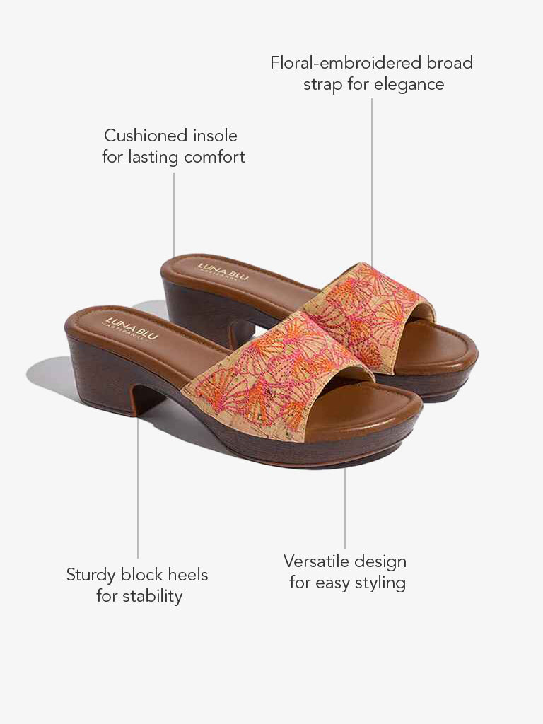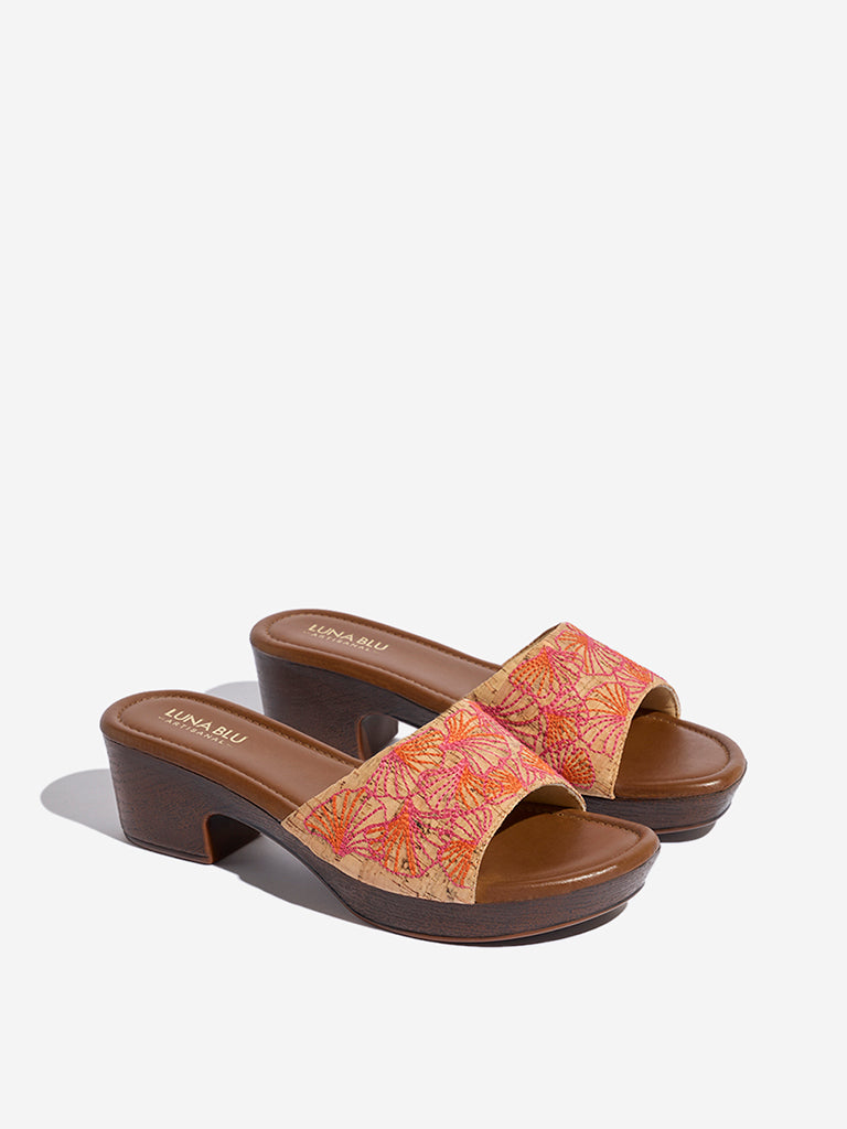 These tan sandals from Luna Blu showcase a broad strap adorned with delicate floral embroidery for a chic touch. Designed for both style and support. they feature a cushioned insole for comfort and sturdy block heels for effortless elevation.