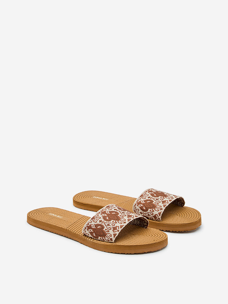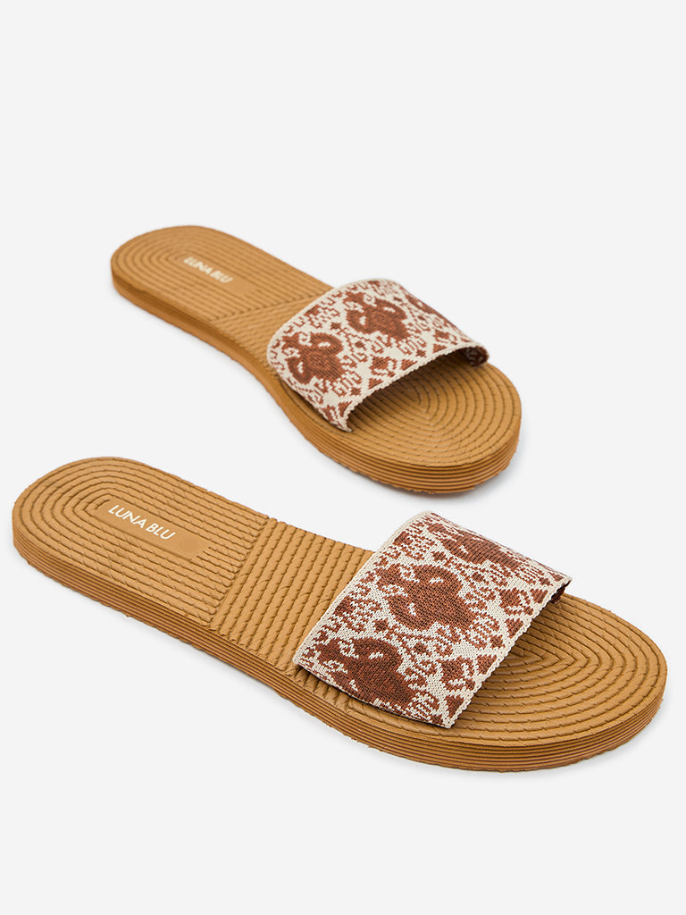 These tan flip-flops by Luna Blu feature a knitted strap with abstract designs across the top of its foot. Crafted with durable material. it includes a textured insole and grip-rich outsole.