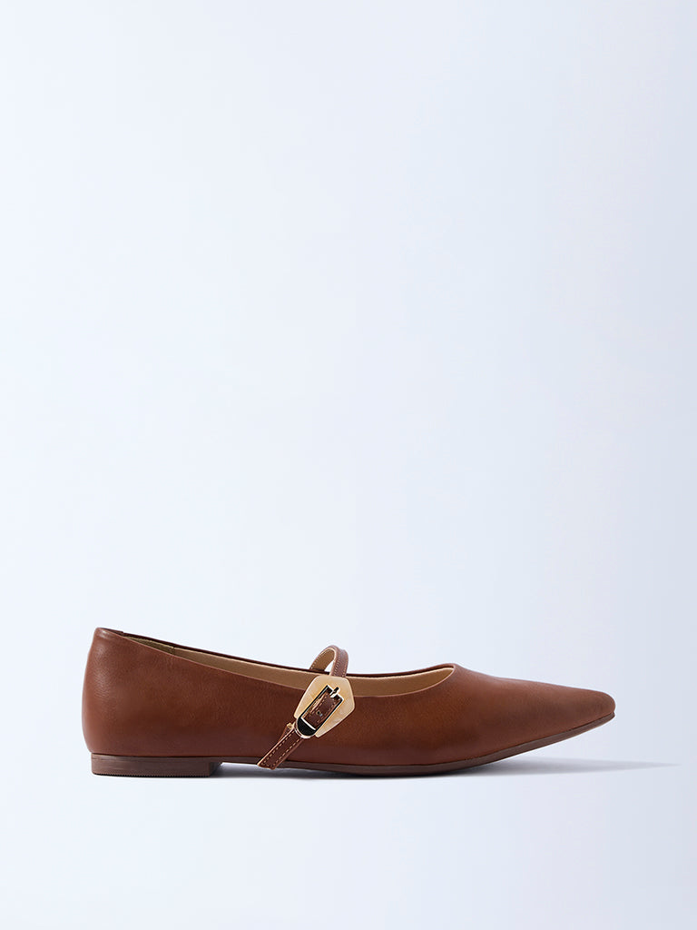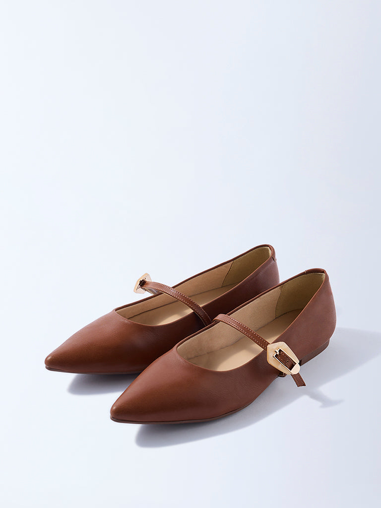 Slip into understated drama with these tan Mary Janes shoes from Luna Blu. The warm earthy tone gives the pair a quietly luxurious feel. while the pointed toe and slim strap create a sculpted. ballerina-meets-modern edit. Finished with a soft. low-profile sole. they deliver comfort without losing their fashion edge.
