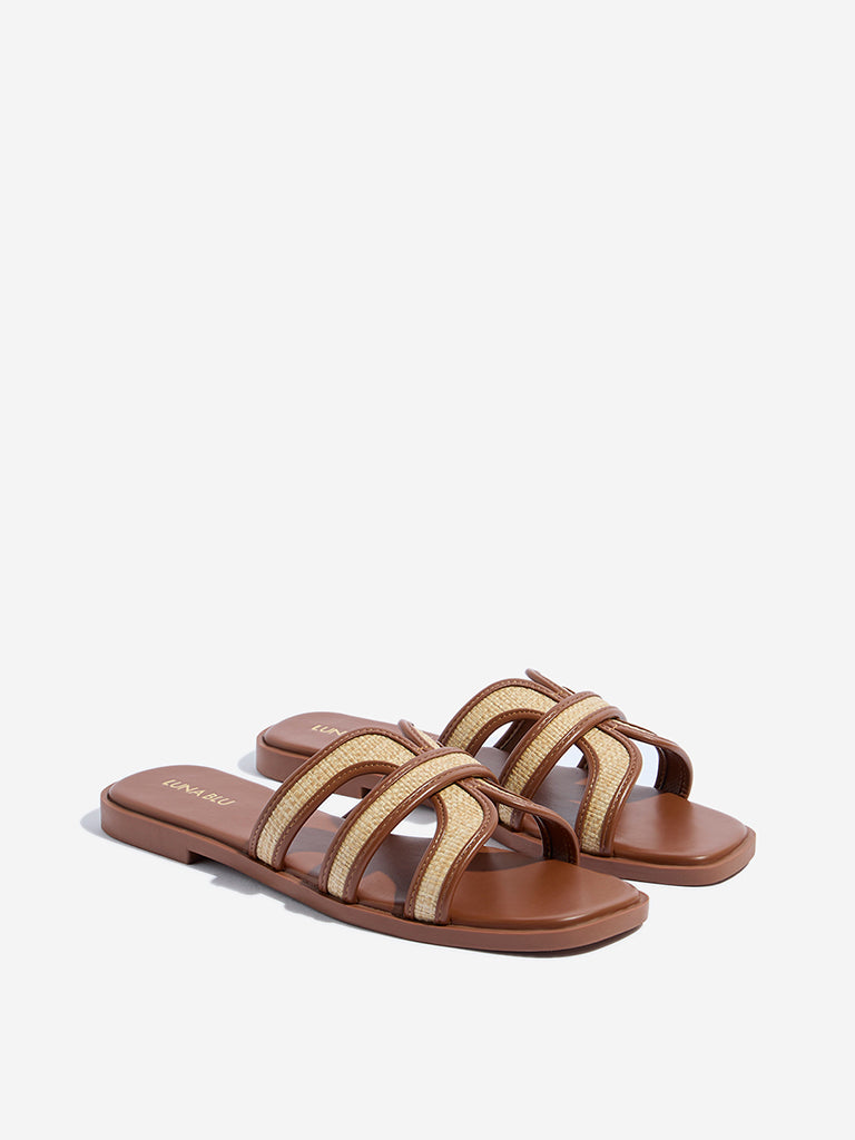 These tan slides from Luna Blu blend laid-back charm with everyday elegance. Designed with a mix of smooth tan material and straw-textured weave. the multi-strap profile ensures a secure yet stylish fit. Set on a flat base with a cushioned insole. they’re perfect for everything from weekend strolls to casual brunches.